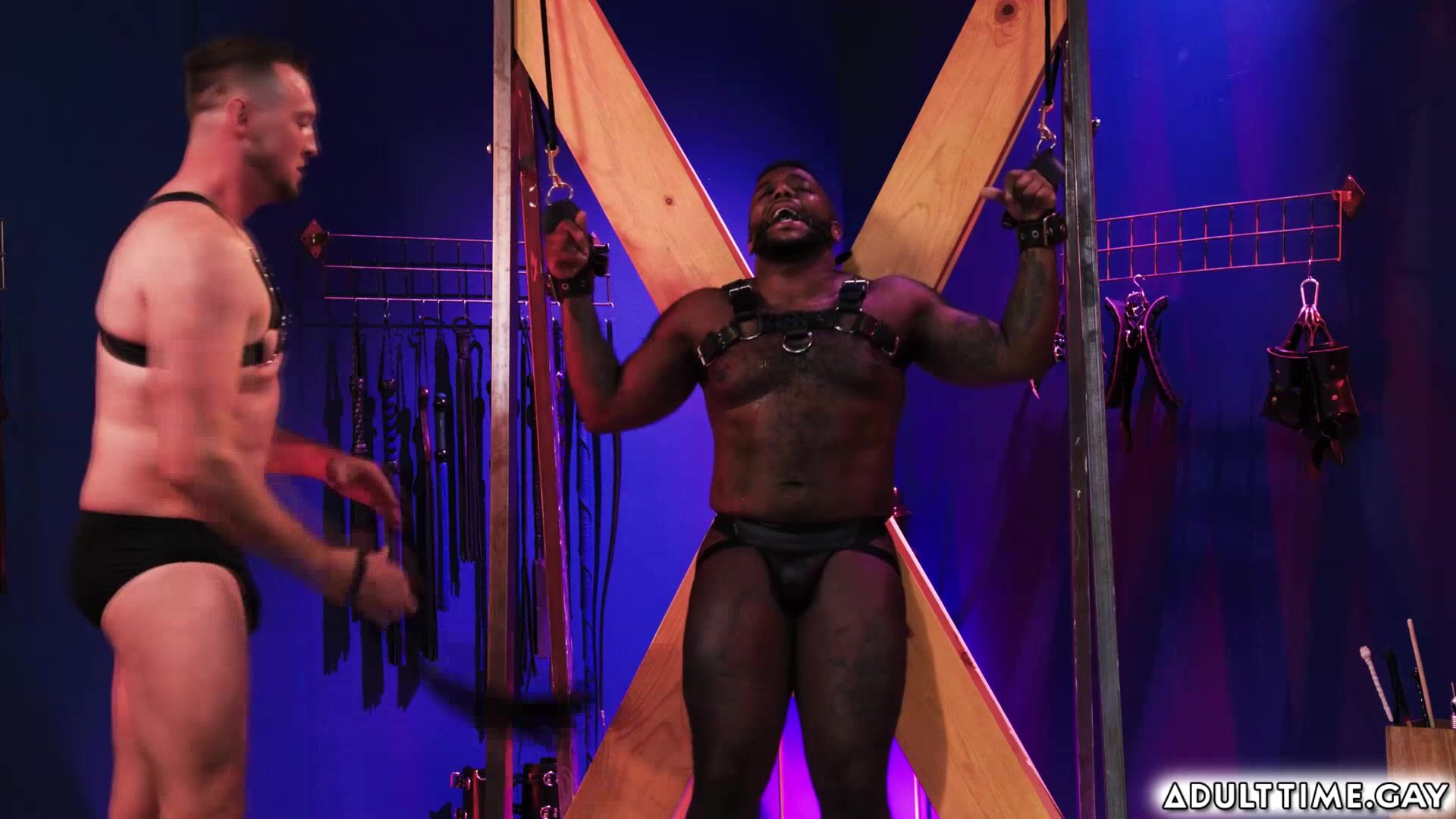 Micah Martinez clad in a leather harness. Pierce Paris circles him, running his hands all over Micah's body. The sexual tension is unmistakable, the need for each other undeniable. Pierce finally breaks out the paddle, there is promise of a thrilling encounter that neither of them will ever forget