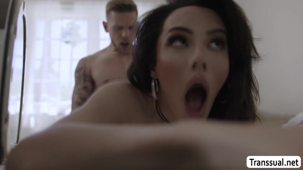 Hot Trans babysitter is in the laundry room and her horny boss starts fucking her ass.Instead of getting mad,she throats his hard big cock passionately and lets him fuck her wet ass again on the couch.