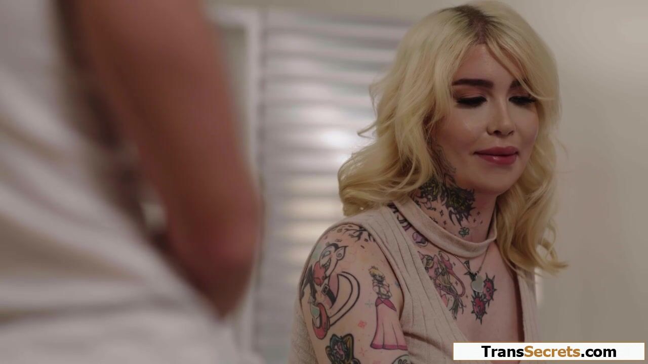 Bossy busty tattooed tgirl Gracie Jane is a real hotwife and lets the sales guy seduce her.The blonde shemale gets boob sucked and sucks dick.The trans is 69 facefucked before taking over and stuffing her tranny cock in his ass to anal bareback him