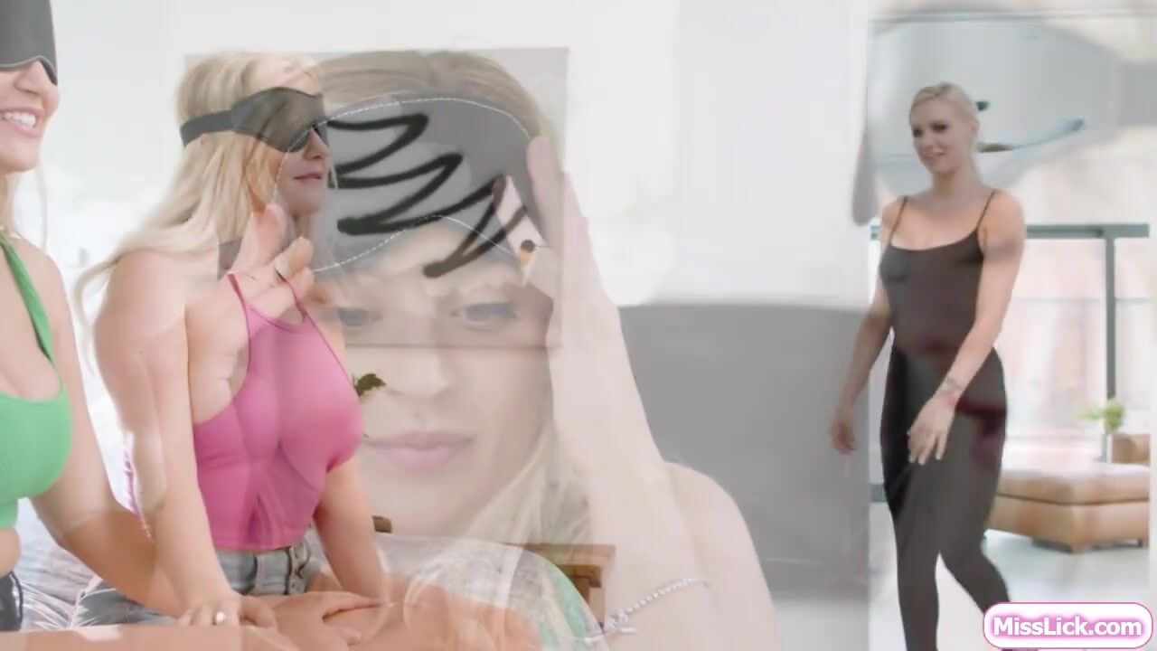Lesbian couple hired an experienced woman for their first threesome.They were blindfolded while the milf is caressing and making them kiss.After stripping naked, blonde babe is pussy licking her hairy girlfriend while the cougar is sucking big tits