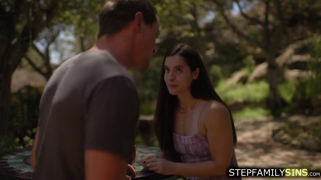 Description: Brunette Abbie Maley is alone in the family camping with her stepcousin.The guy is teasing her until she gives in.They start kissing and getting naked.She goes deepthroating his big cock then he licks her shaved pussy in return before they fuck