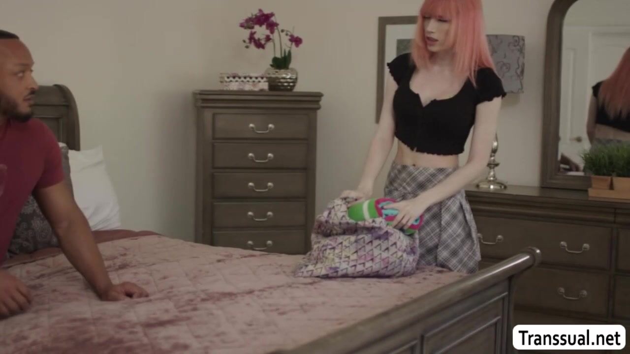 Shemale babe Mimi Oh and her black stepbro are on the bed kissing each other.After that,she throats his big black cock passionately and in return,her stepbro licks her ass first before he bareback fucks it so deep and hard.