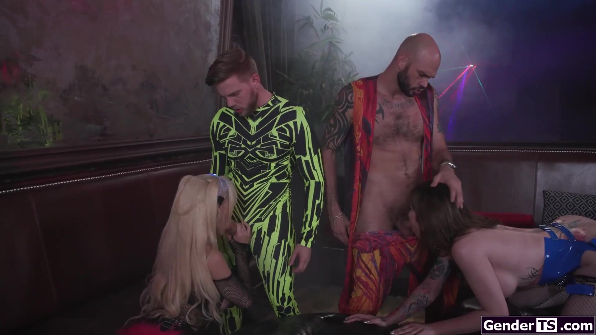 Busty tgirl Gracie Jane kissing big tits shemale Brittney Kade ifo two guys at the club.The transsexuals jerk off each others hardons.The trans babes suck cock and Gracie double anal rides cock.The horny dudes bareback the super hot tranny sluts