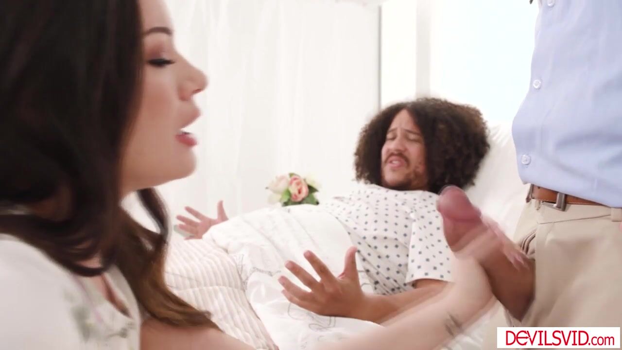 Wife Alison Rey asking the doctor why her husband doesnt last long during sex,then asks if she can see his dick.The doctor lets her see and suck on it.He is licking her shaved pussy and gets her permission to fuck her in front of her husband.