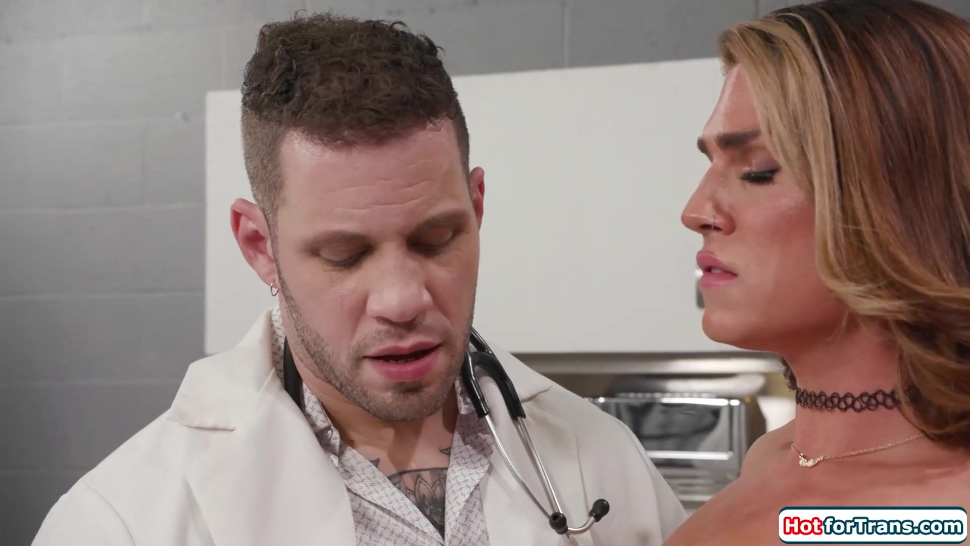 Tgirl Kalli Grace gets hard when her trans friendly doctor touches her tranny dick.He kisses and sucks off his shemale patient and the small tits ts deepthroats his big cock on her knees.The brunette transsexual bareback anal rides the docs boner