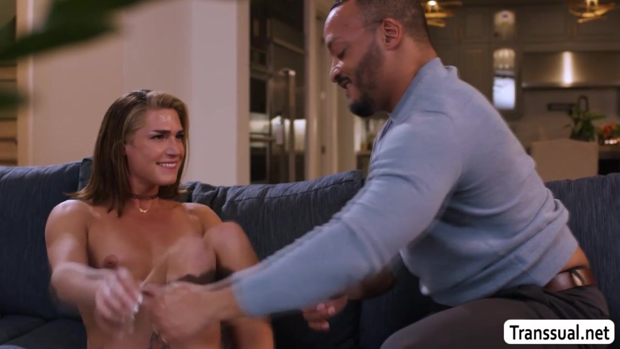Black Dillon Diaz and TS Kalli Grace are on the couch teasing each other.After that,Kalli throats Dillons hard big cock passionately and in return,Dillon bareback fucks her tight wet ass so deep and hard.Go to Transsual.net for discount!