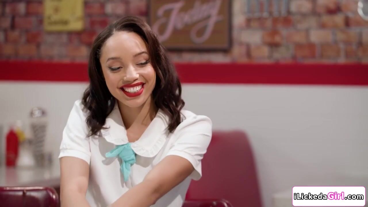 Alexis Tae is hanging out with the milf cafe attendant Serene Siren.Serene closed the store and starts caressing the ebony babe.She sucking her small tits,licks her pussy then gets facesitted.Alexis is licking her ass while masturbating her clit.