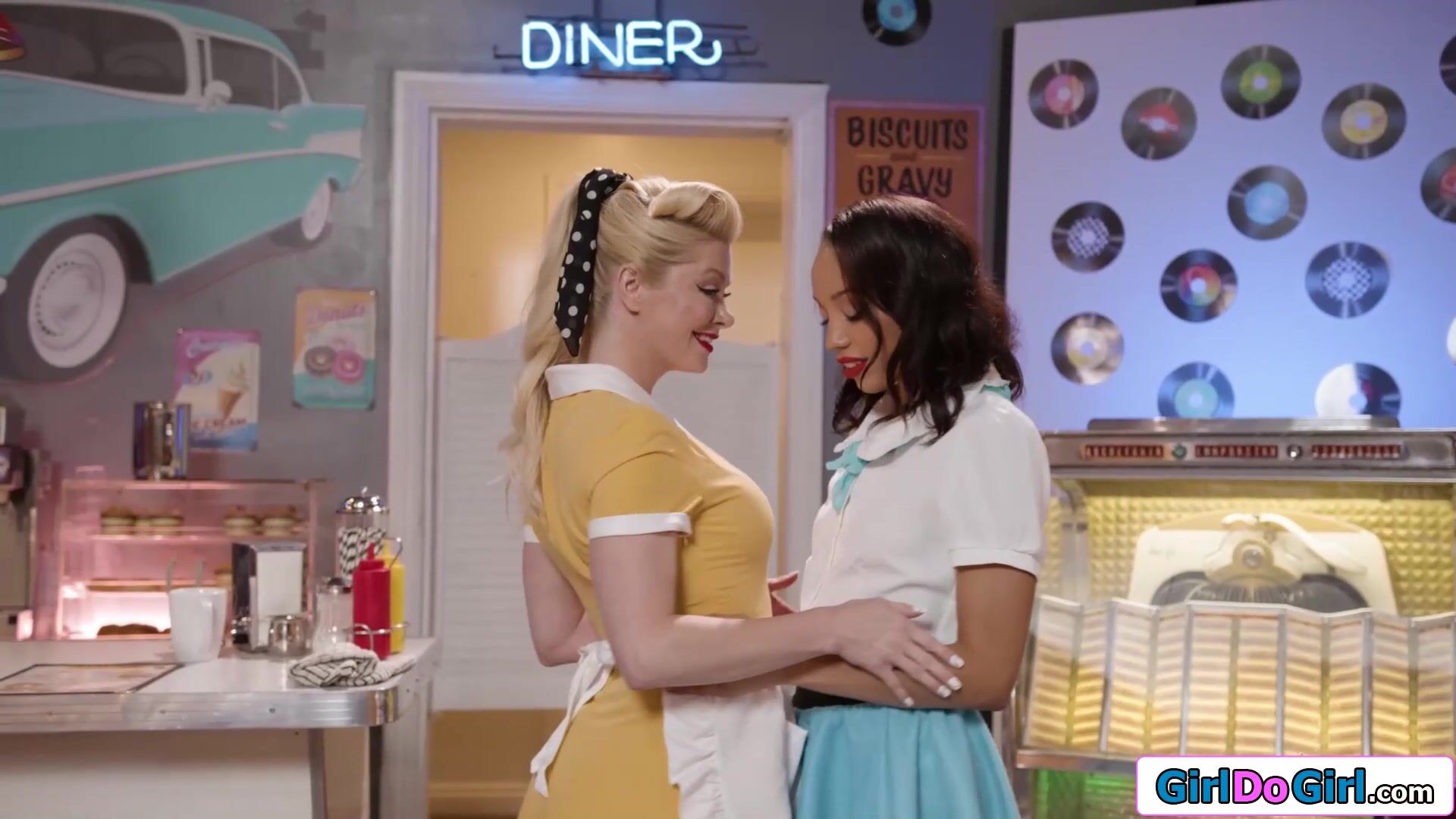Description: Busty milf waitress Serene Siren has her eye set on her hot ebony customer Alexis Tae.A kiss is all it takes.The big boobs cougar masturbates the small tits black babes pussy and is fingered while getting oral.The blonde licks the brunettes snatch