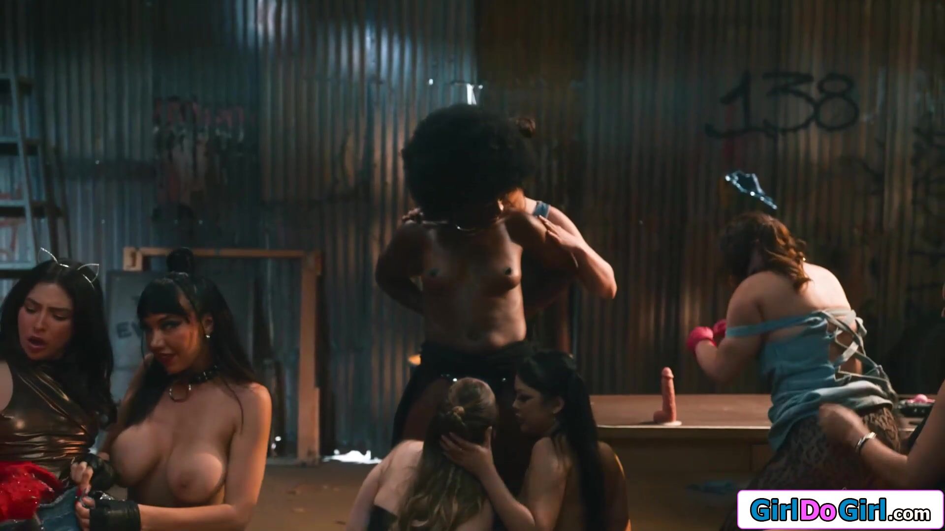 Ready for the all girl Warriors parody?When DJ announces that power aint about fists n fury but about tits and pussy the lesbian gangs lick and fist pussy and fuck strapons.Even a busty officer cant break them apart as she joins this facesitting orgy