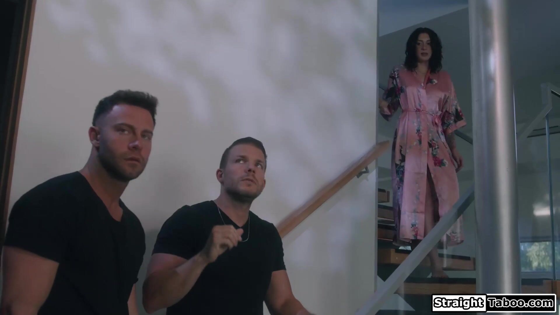 Busty tattooed wife Charlotte Sins overheard a bit too much and her husbands bf wants prove she will not tell.The brunette offers them a threesome.The big tits babe is pussy licked while sucking cock and lets both guys fuck her snatch hard