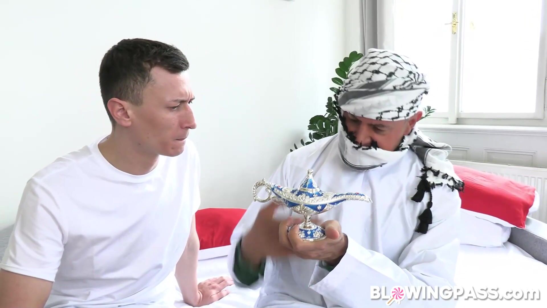 Czech babe Lady Dee is playing a horny genie who craves for big cocks.She pops out from the bottle and starts pleasing two men by deepthroating and doing double blowjob.One guy licks and bangs her hairy pussy while the other is face fucking her.