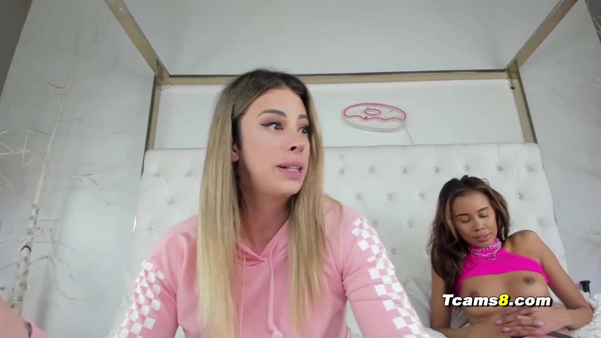 Blonde shemale got fuck by tanned babe's dildo Video