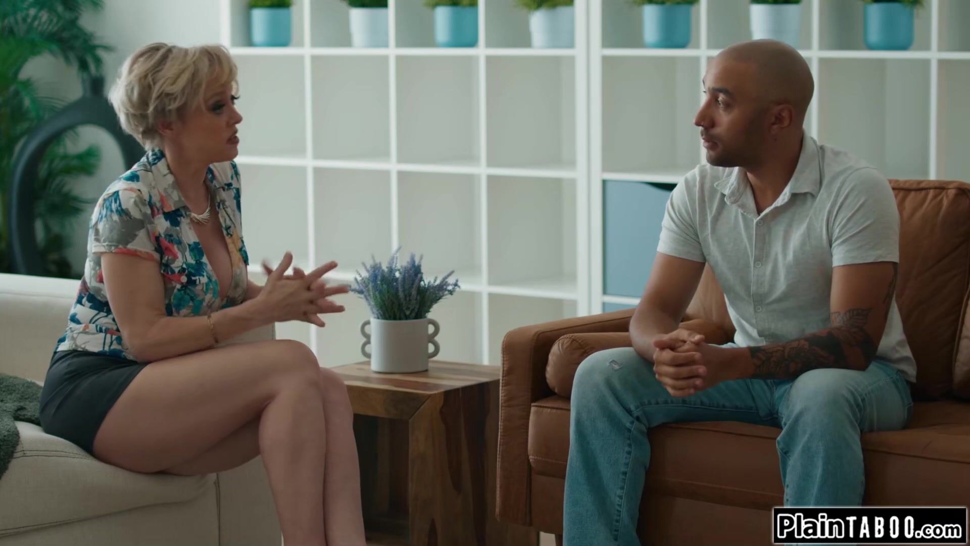 Busty shrink Dee Williams is willing to help her client out with his touch deprivation.The big tits milf kisses him and deepthroats his big black cock.After the blonde cougar tittyfucked him she gets her shaved pussy licked and filled with his bbc
