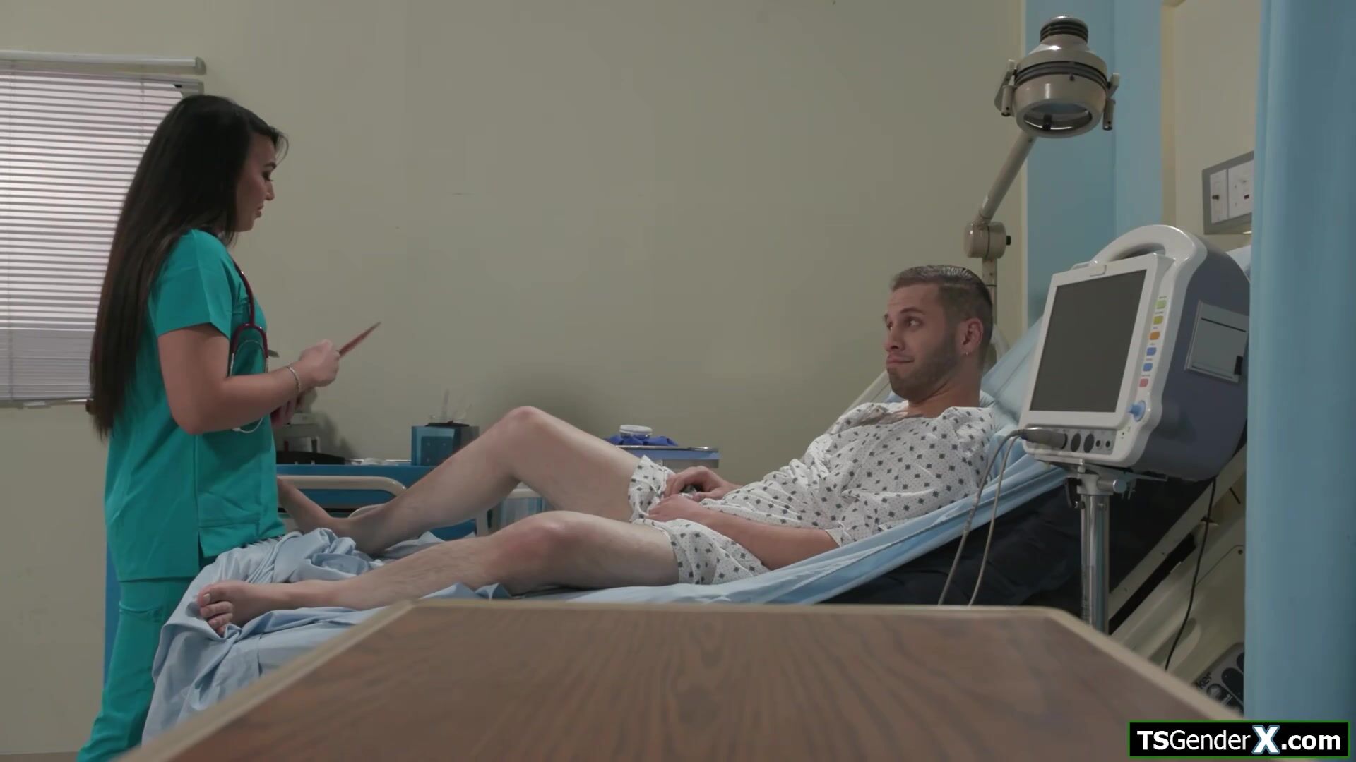 Asian tgirl nurse Kasey Kei gives in to her patients flirtations and lets him suck her perky tits.The shemale deepthroats and kisses him while giving a double handjob.The guy ass licks the trans and bareback anal thrusts his dick up her butt