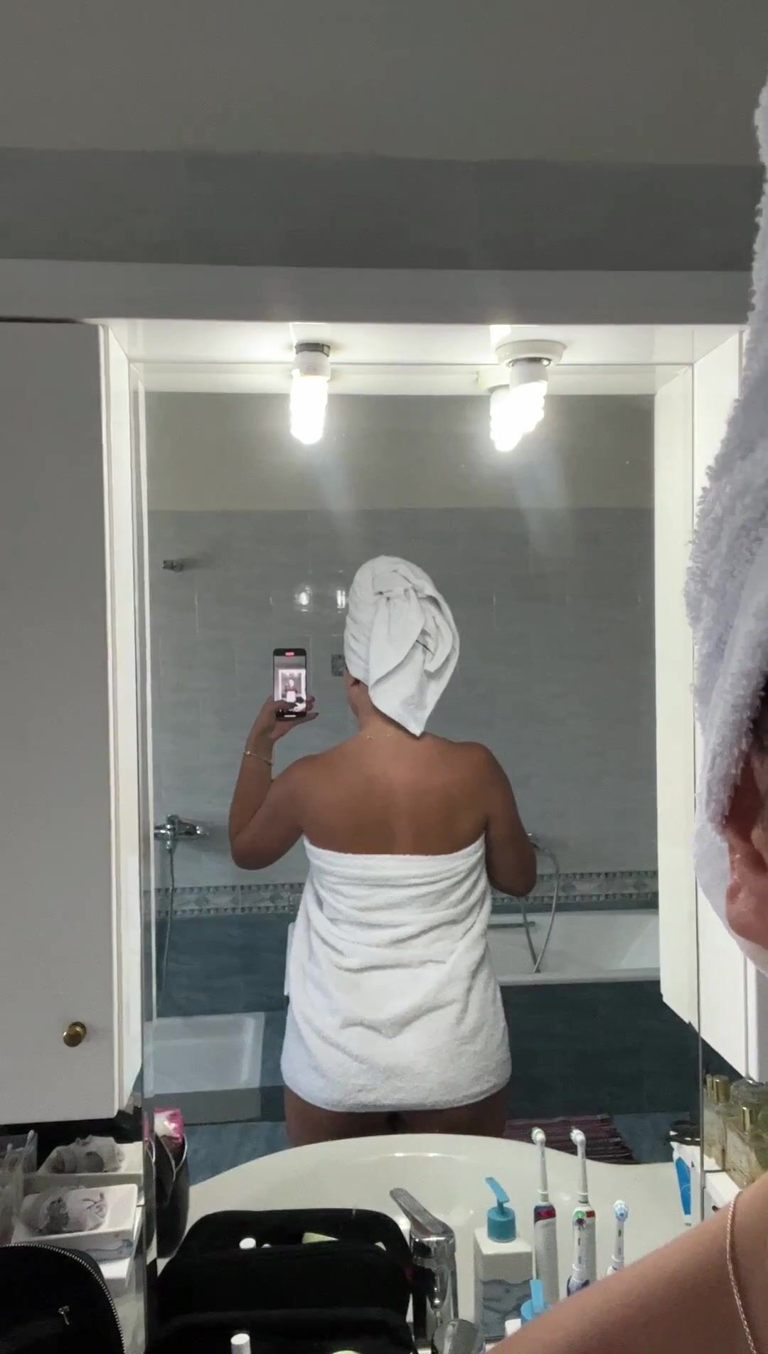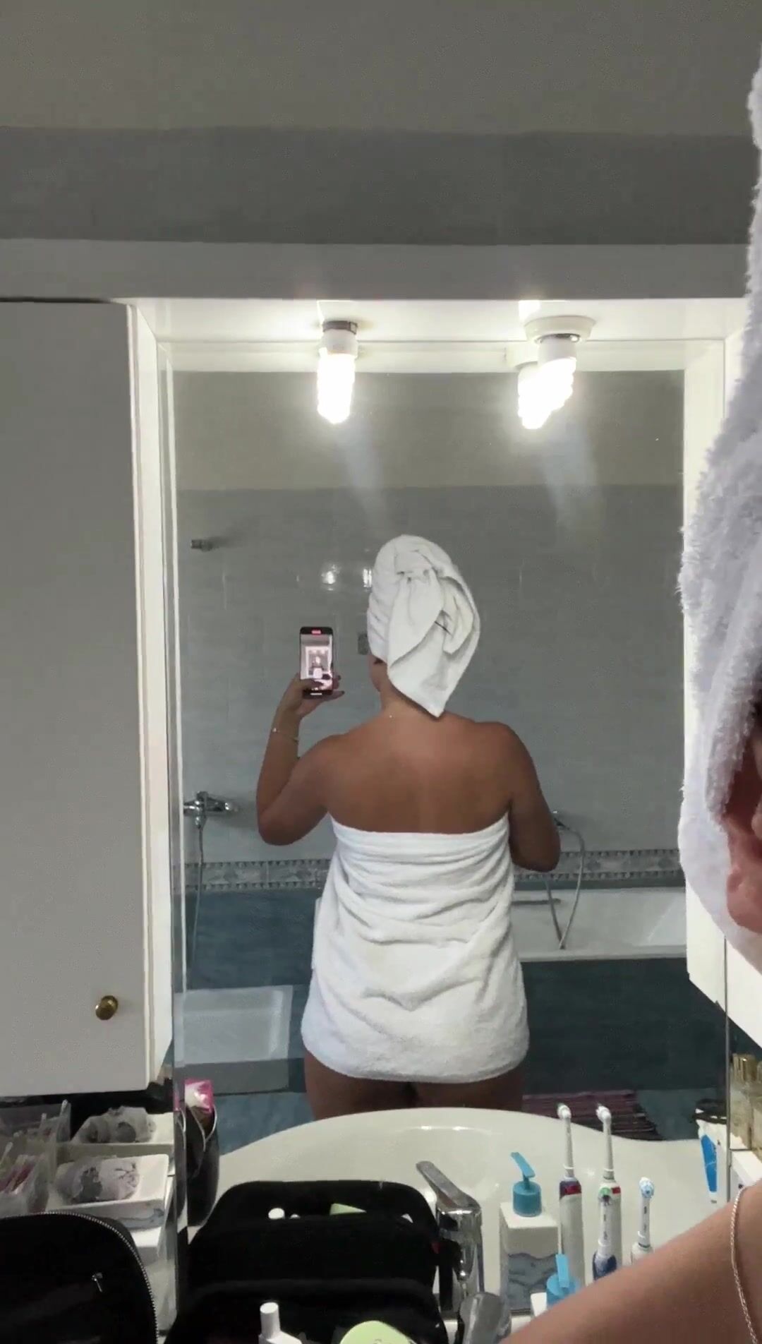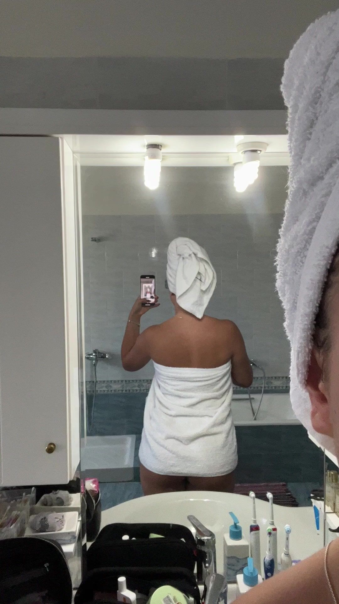 Wife decided to be naughty today in the shower and drop her towel to reveal her slim-waist and big ass