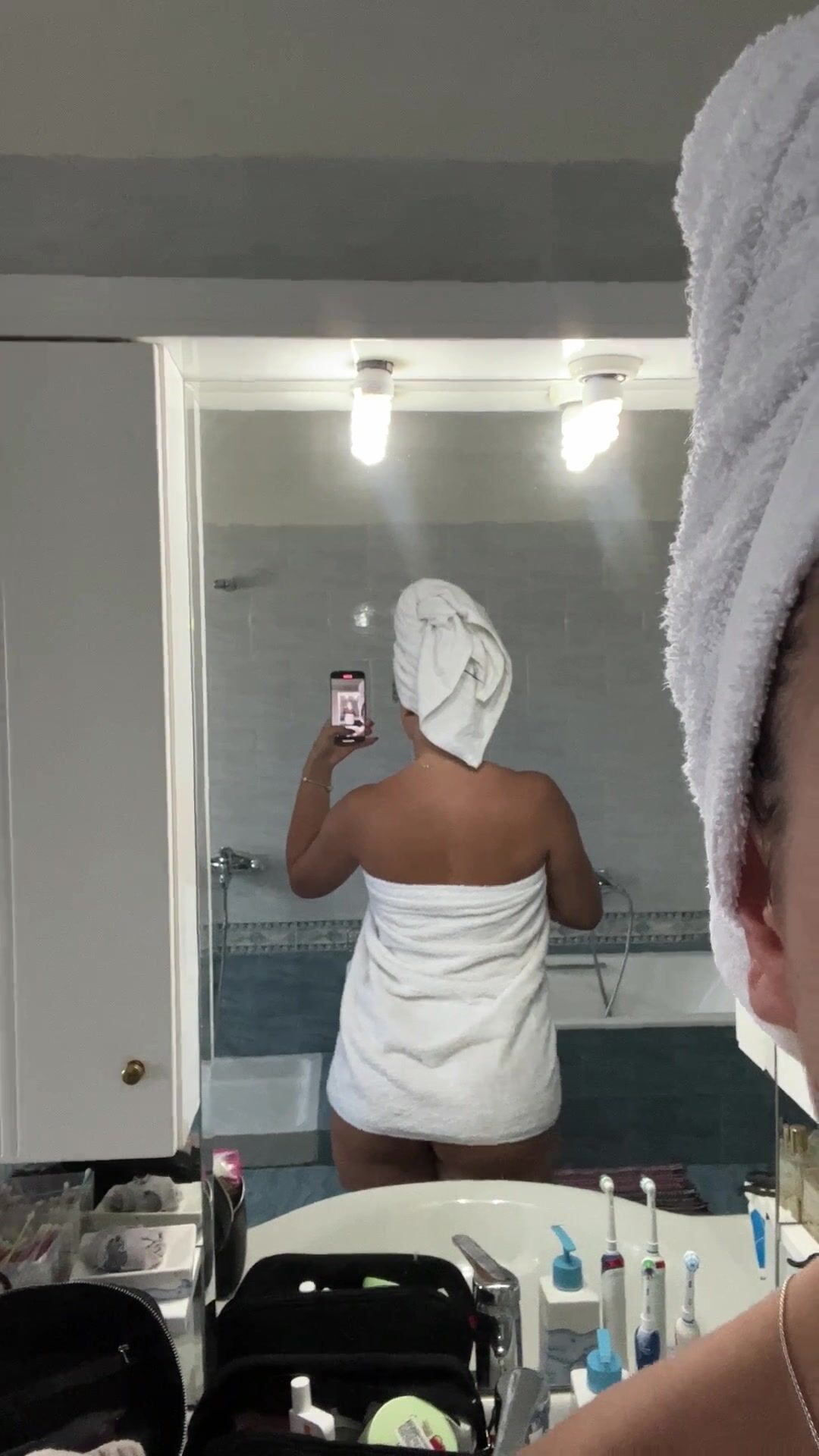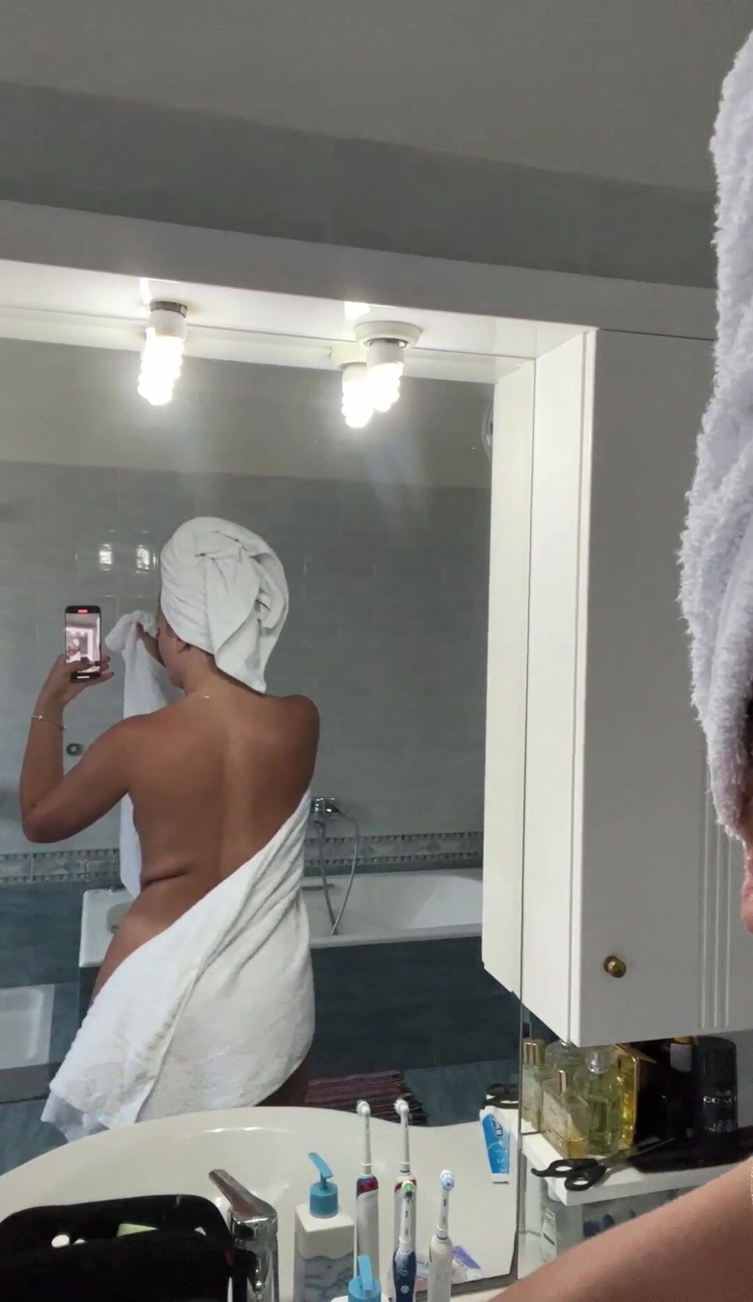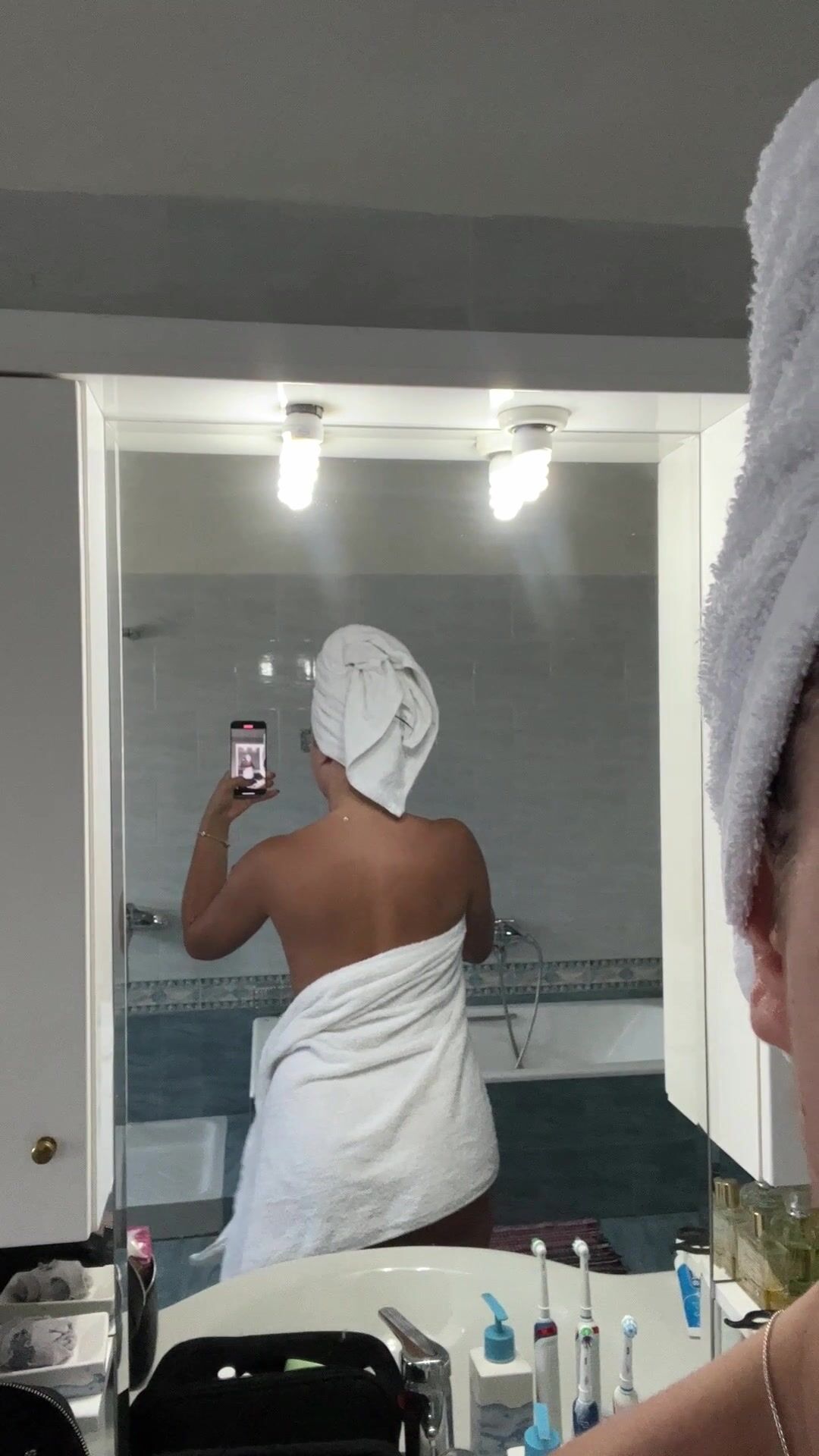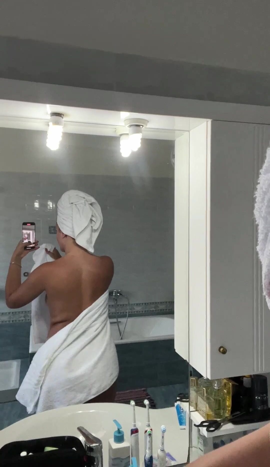 Wife decided to be naughty today in the shower and drop her towel to reveal her slim-waist and big ass