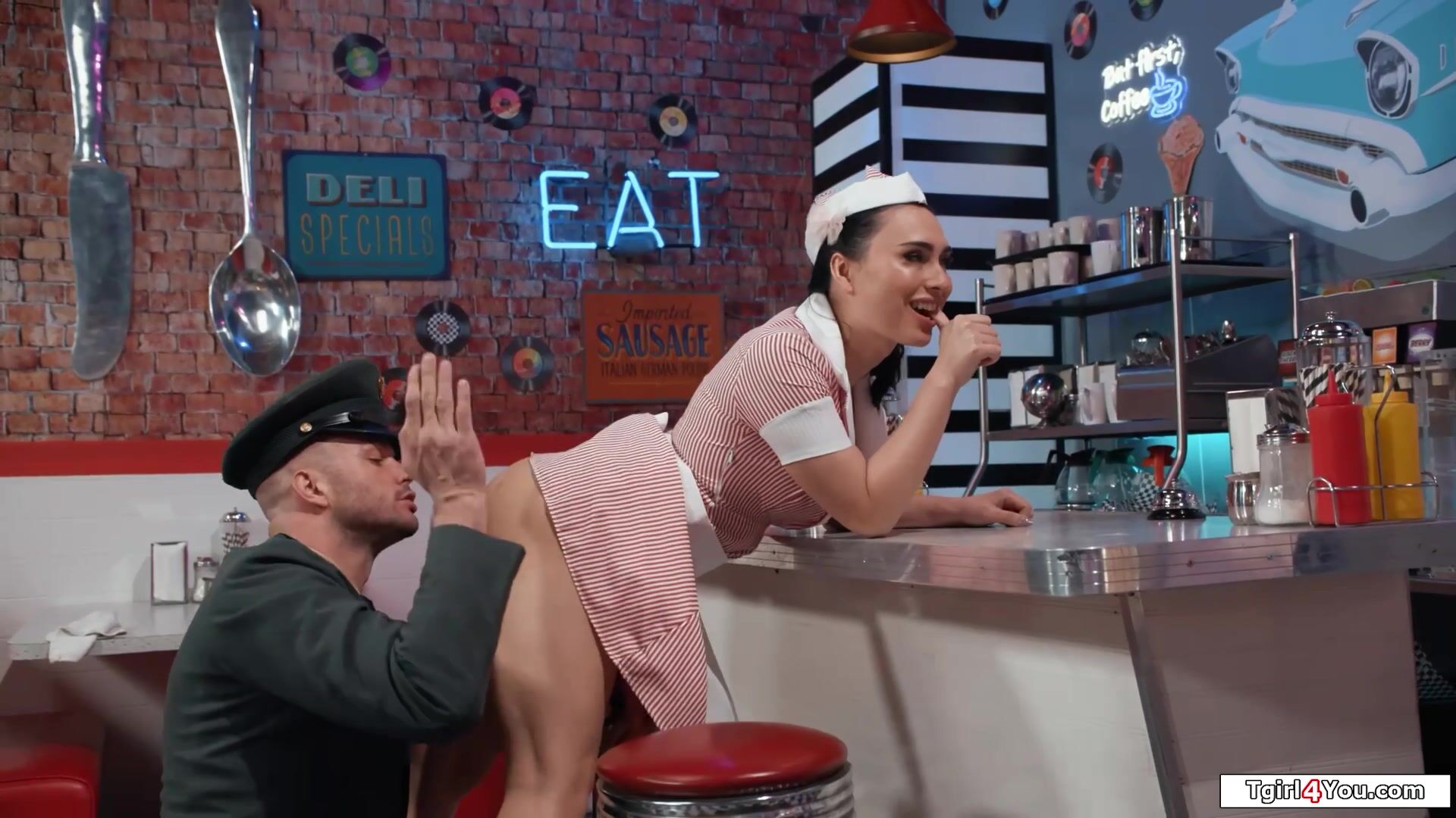 Asian shemale waitress Ember Fiera cleaning when her husband shows up.He rims the big tits tgirl in her diner and sucks her small tranny dick.The oriental trans deepthroats his cock and after a double handjob the busty transsexual is anal barebacked