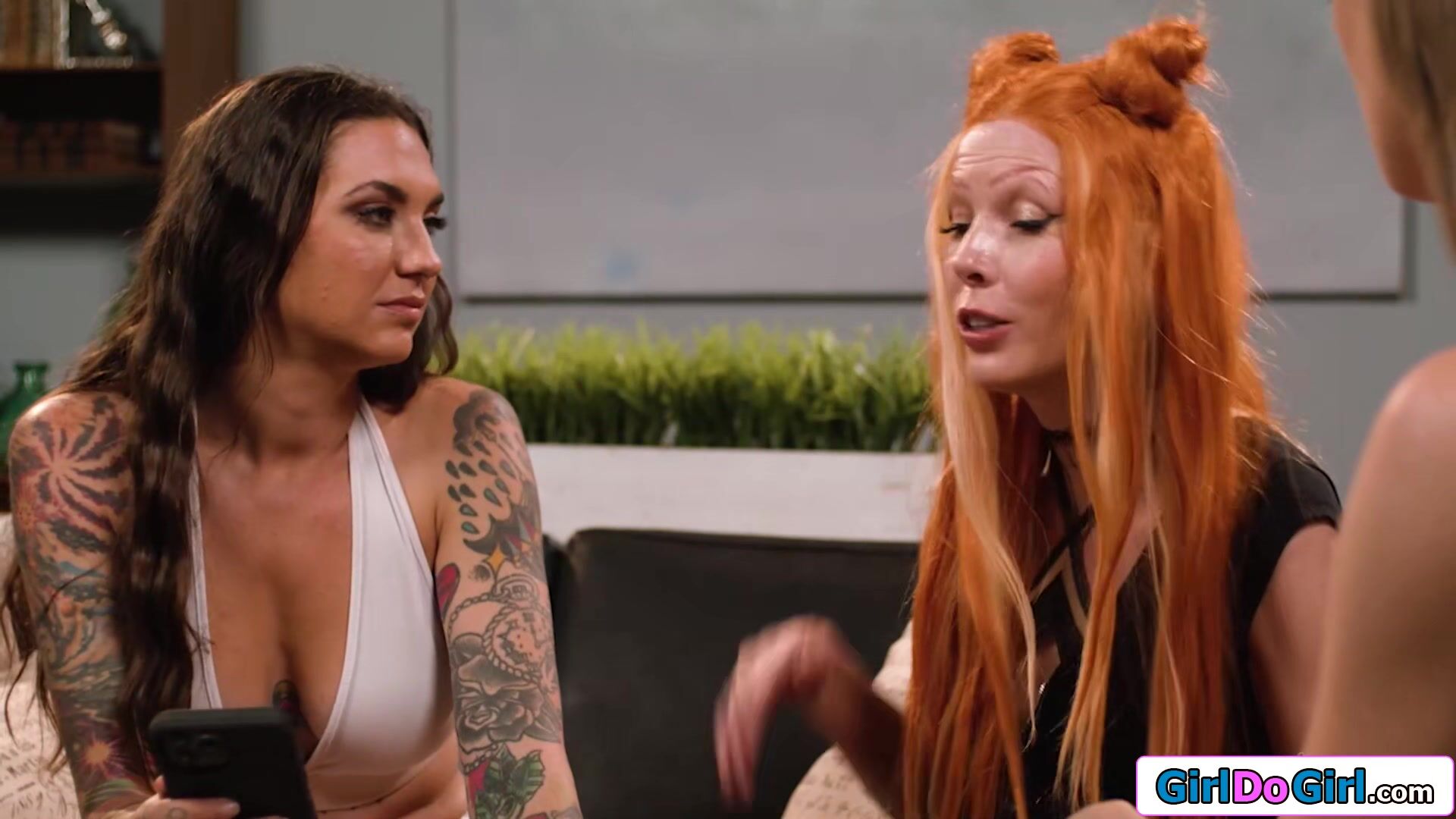 With Robin Coffins blind date canceled lesbian couple Olivia Madison and Rocky Emerson have another idea.A lesbian threesome.The redhead is titsucked before getting oral by the busty tattooed brunette.The small tits gf licks pussy while getting eaten