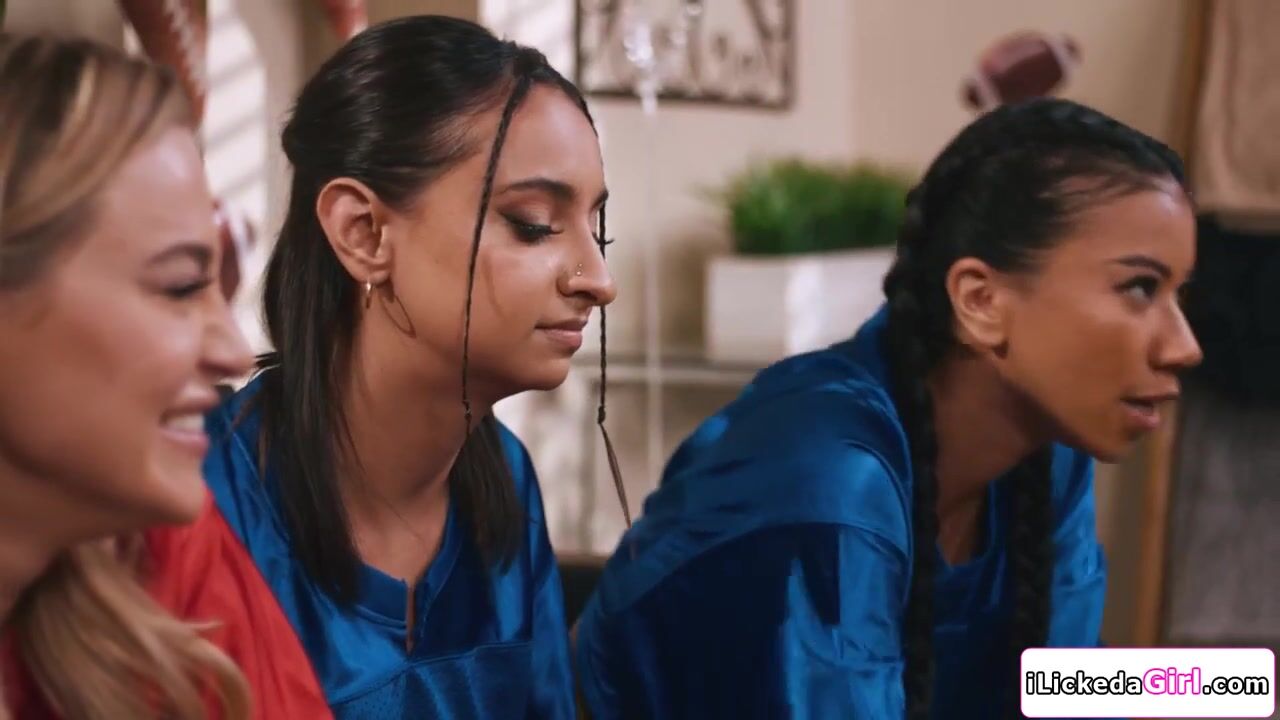 Blonde lesbian Blake Blossom makes a bet with her friends Nicole Doshi, Hailey Rose and Ameena Green that is her team wins,they will fuck her.She did won and so the 3 big tits babes gang on her, take turns pussy licking and facesitting their bff.