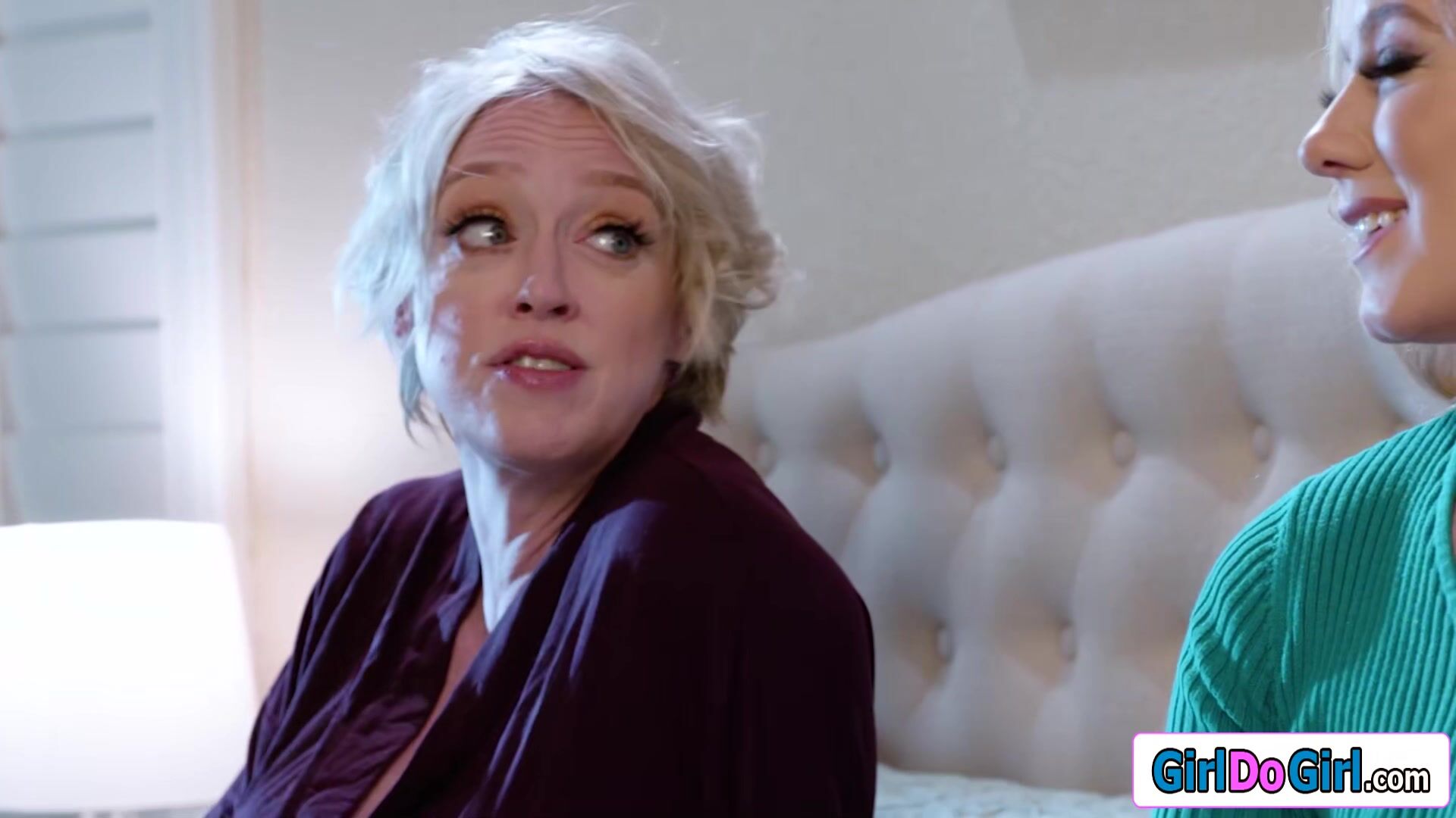 Stepdaughter River Lynn feels sorry for stepmom Dee Williams that her stepdad canceled.The small tits blonde takes control and masturbates the petite blindfolded milf.She strapon fucks the busty cougar when shes caught.Still horny they 69 pussy lick