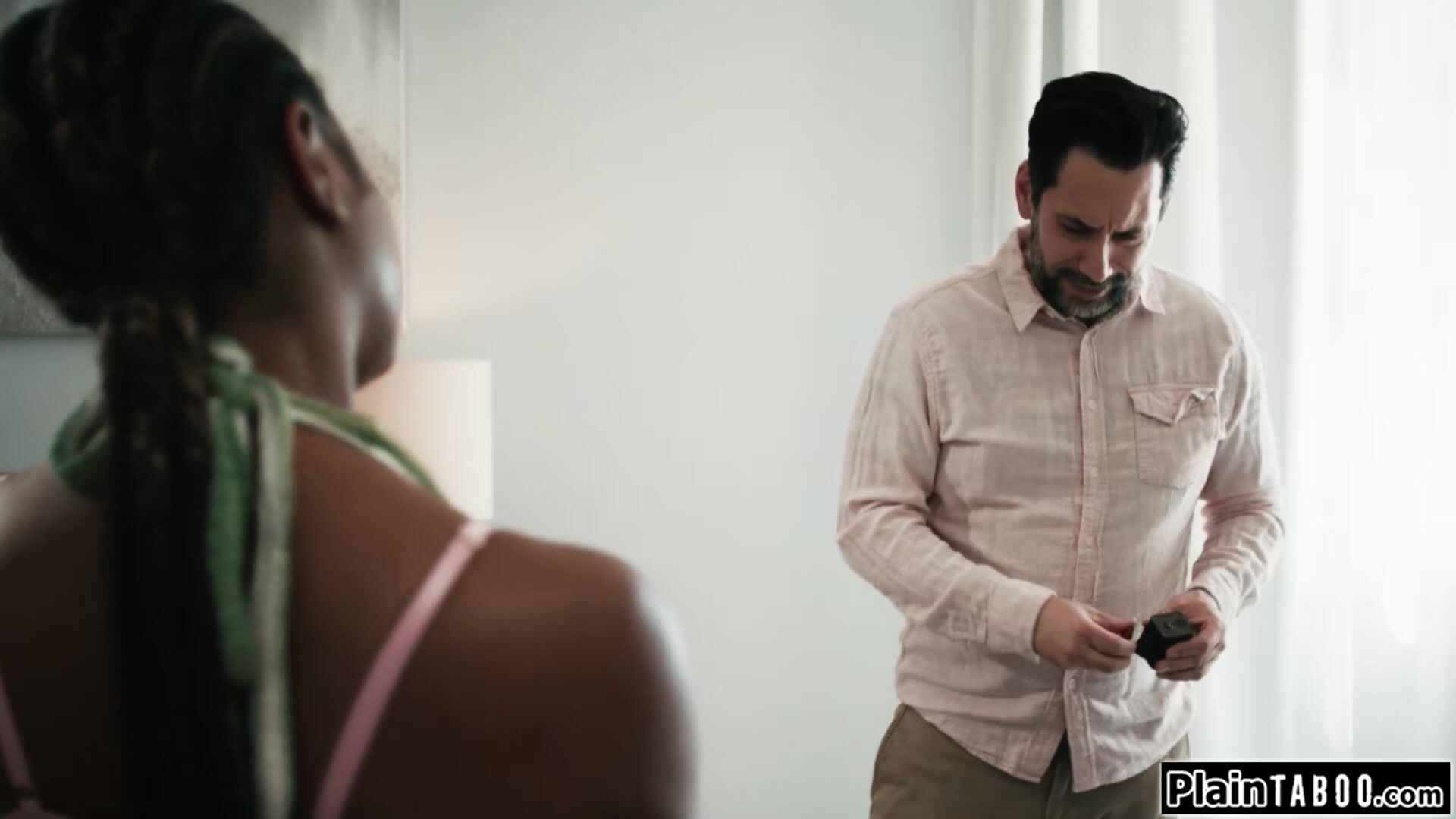 Description: Stepdad caught a glimpse of his ebony stepdaughter Destiny Mira nude on the nannycam.She catches him with a camera in her room and makes him watch her.On his knees the black babe makes him eat her out.She deepthroats and squirts from fucking