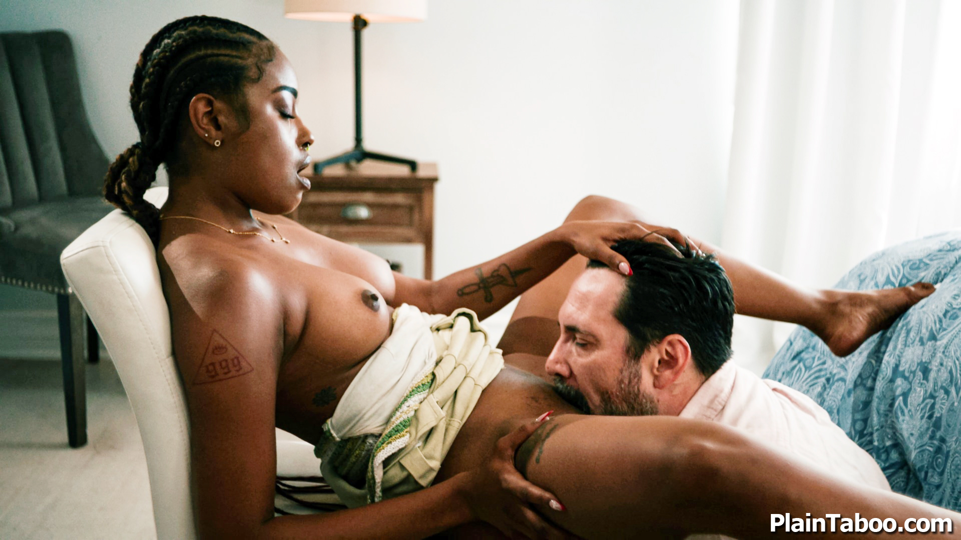 Stepdad caught a glimpse of his ebony stepdaughter Destiny Mira nude on the nannycam.She catches him with a camera in her room and makes him watch her.On his knees the black babe makes him eat her out.She deepthroats and squirts from fucking