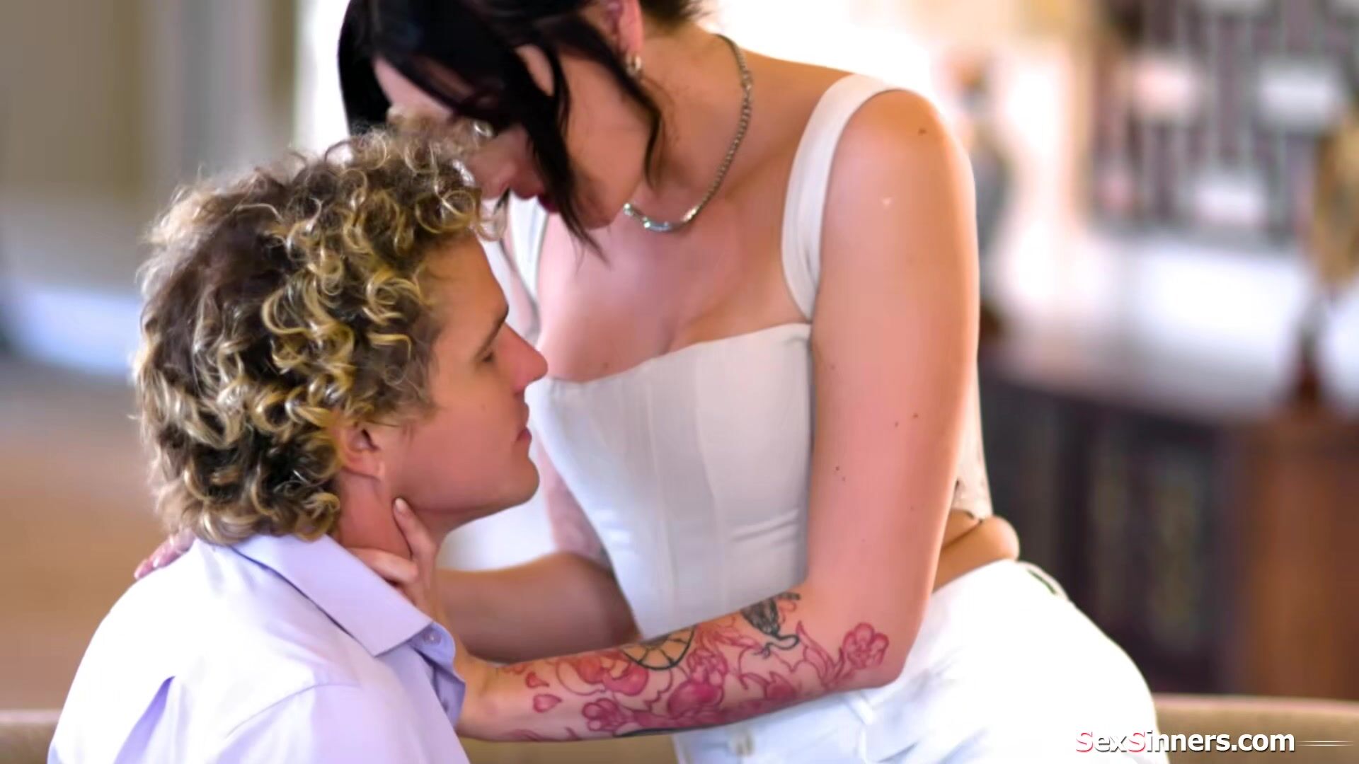 Guy lets his stressed out wife Charlotte Sins have her way with him.The busty tattooed brunette puts him against the wall and jerks him off.The big tits dominant babe ass rides his face.She puts his legs up while she fucks his cock with her pussy
