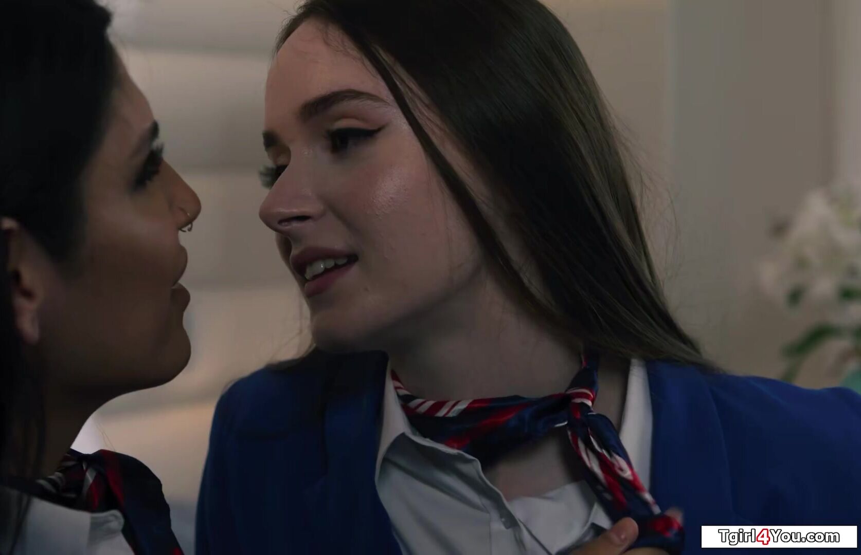 Shemale flight attendant Zariah Aura and her busty colleague Hazel Moore stay the night.The latin tgirl masturbates the brunette while she gets her big cock deepthroated.The small tits tranny licks the big boobs babes hairy pussy and fucks her