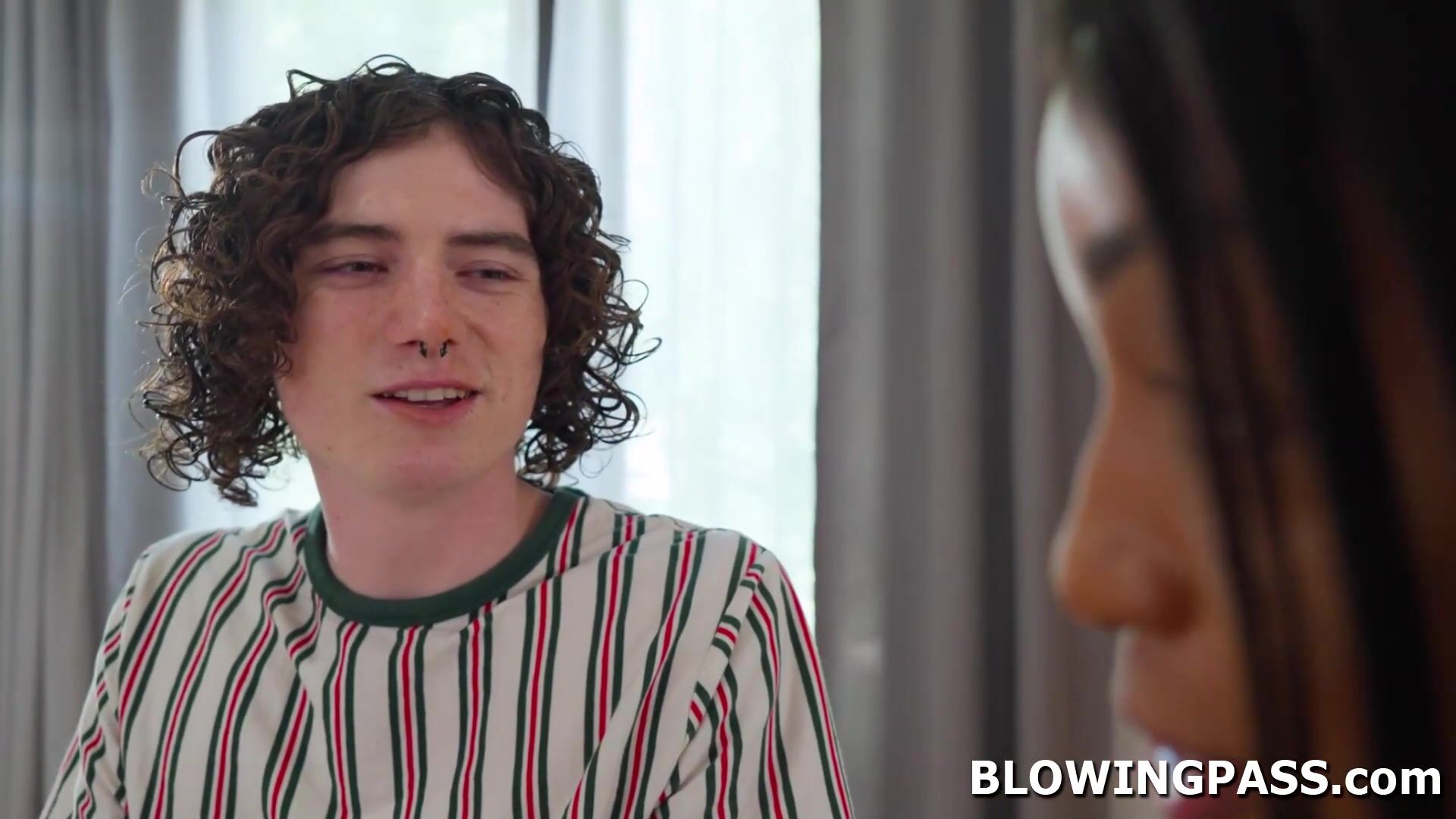 Ebony Lily Starfire lets her white classmate stay for a while and have fun after studying. She puts her hand on his pants then flashes her big tits. The guy grabs and squeezes them. After getting him hard the petite babe goes down sucking his cock