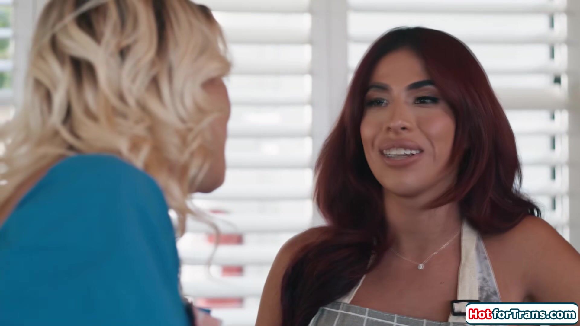 Cherry Kiss shares her secret with her shemale daughterinlaw Avery Lust.Shes a dominatrix and the tgirl would love to be dominated by the milf.With her hands tight the trans jerks off and is deepthroated.The blonde rides the tranny till she squirts