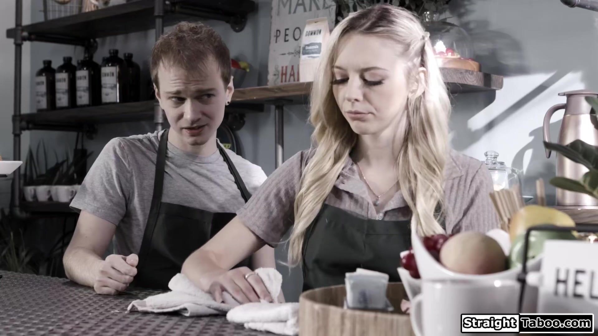 Lily Larimars bf cheated on her for being too uptight.The small tits teen will prove she can be freaky and sucks him behind the counter of the cafe.He fingers the blondes pussy while rimming her.At the risk of getting caught they fuck in public