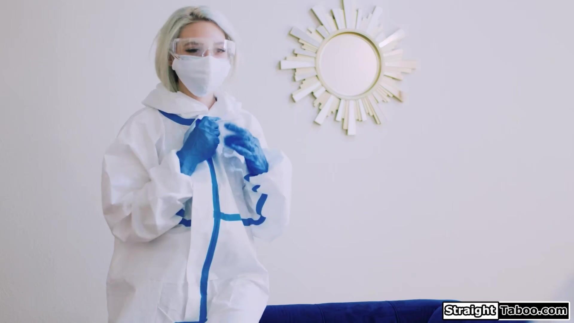 Lola Fae and her bf wear protective clothing due to the pandemic.They are still horny and the small tits babe starts to masturbate while he jerks off his hard cock.The petite blonde gives him a footjob and bends over to get doggystyle fucked