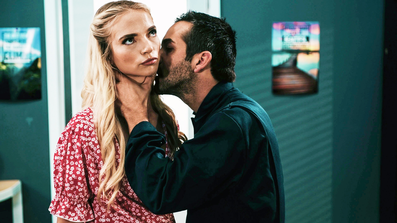 Student Lana Sharapova is creeped out by the janitor when he comes on to her.If she says no he will go after another one so she lets him have his way.He kisses and licks the small tits coeds hairy pussy.The blonde deepthroats and fucks him in class