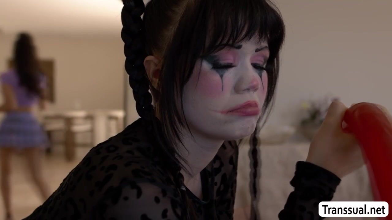 Slutty clown Yhivi is watching her friend TS jerking off using some sex toy.Instead of getting mad,she lets her TS friend use her pussy and she sucks her hard shecock passionately.Go to Transsual.net for the full video of this.
