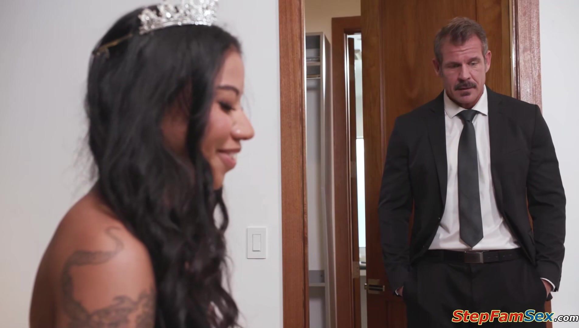 Fatherinlaw tells ebony bride Ameena Green not to worry if she keeps sucking dick the way she does.He takes out his cock and is deepthroated by his daughterinlaw.The petite black babe gets her shaved pussy licked and rides on the guys hardon