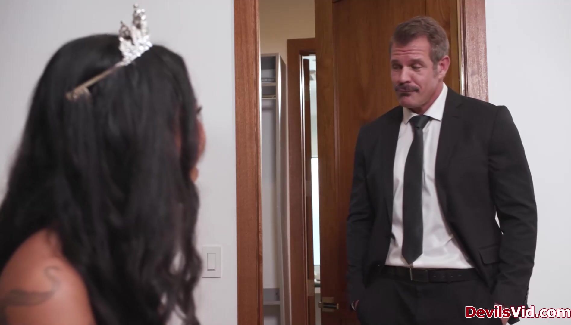 Ebony bride Ameena Green is flirting with her grooms stepdad before the wedding.She impressed him with her blowjob skills.The old man is face fucking the black babe then licks her shaved pussy.Ameena knows it is taboo but she just loves his big cock.