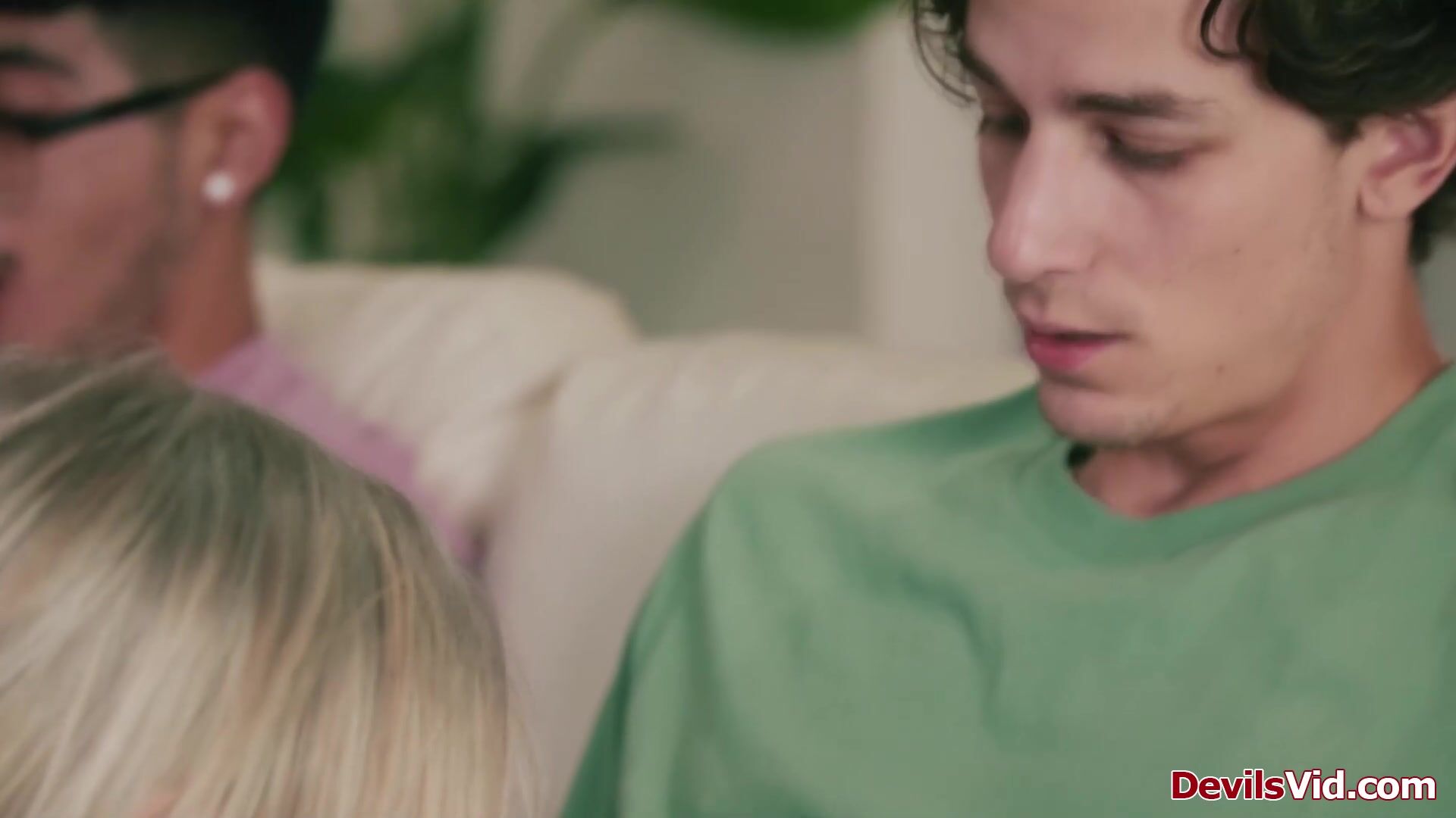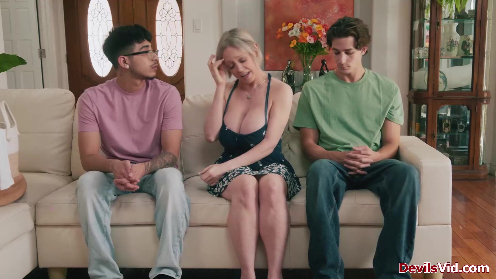 Dee Williams wants her stepson to stop masturbating.For that the big tits milf agrees to have sex with them.She giving sloppy blowjob and titty fucking.The dudes having threesome with their blonde stepmom.They take turns fucking her shaved pussy.