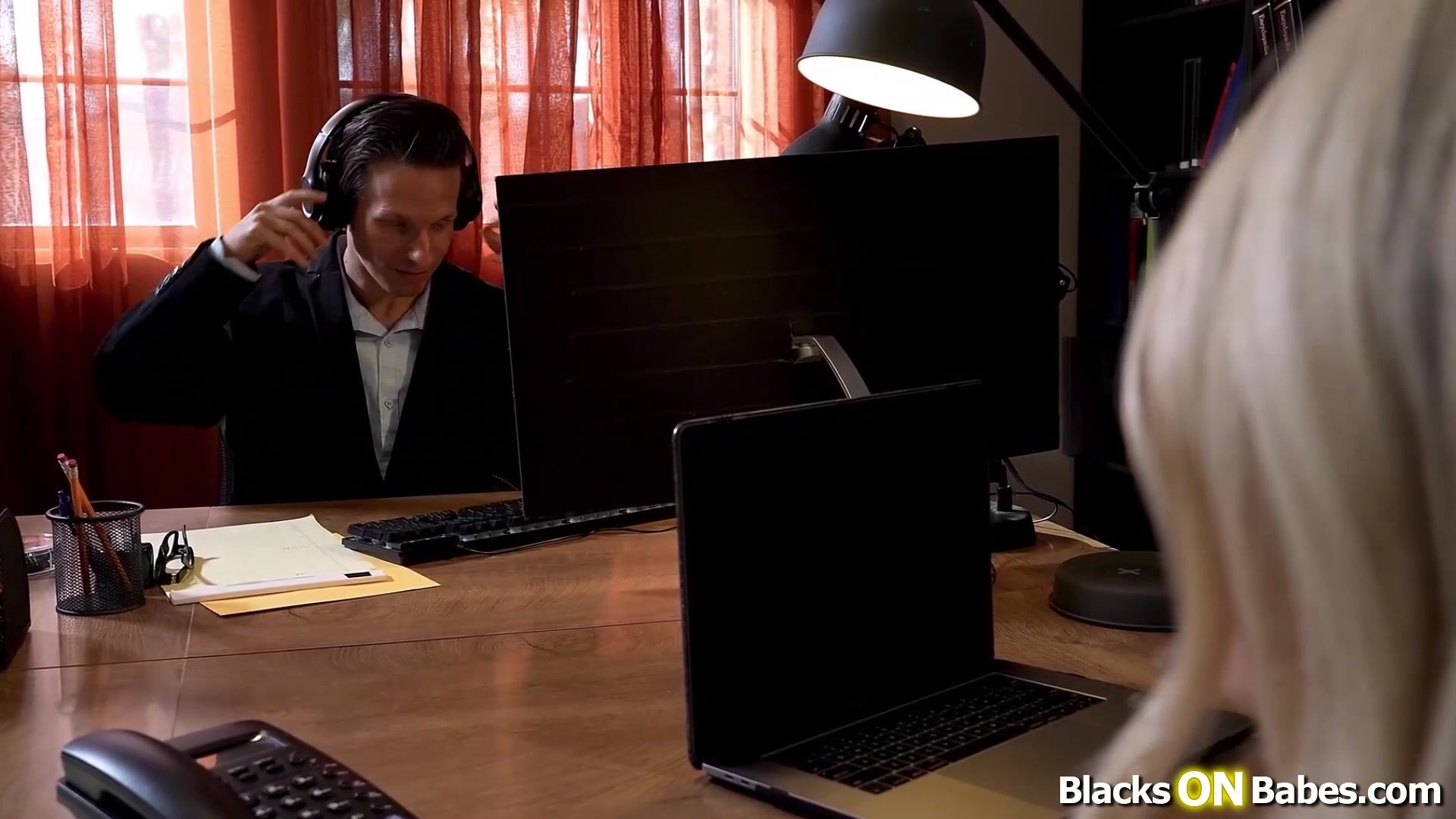 Wife Bunny Madison gets caught by her husband giving her boss blowjob under the table.The big tits babe makes her cuck watch on the side while she is deepthroating his big black cock.Boss fucks the busty blonde employee while her husband masturbates.