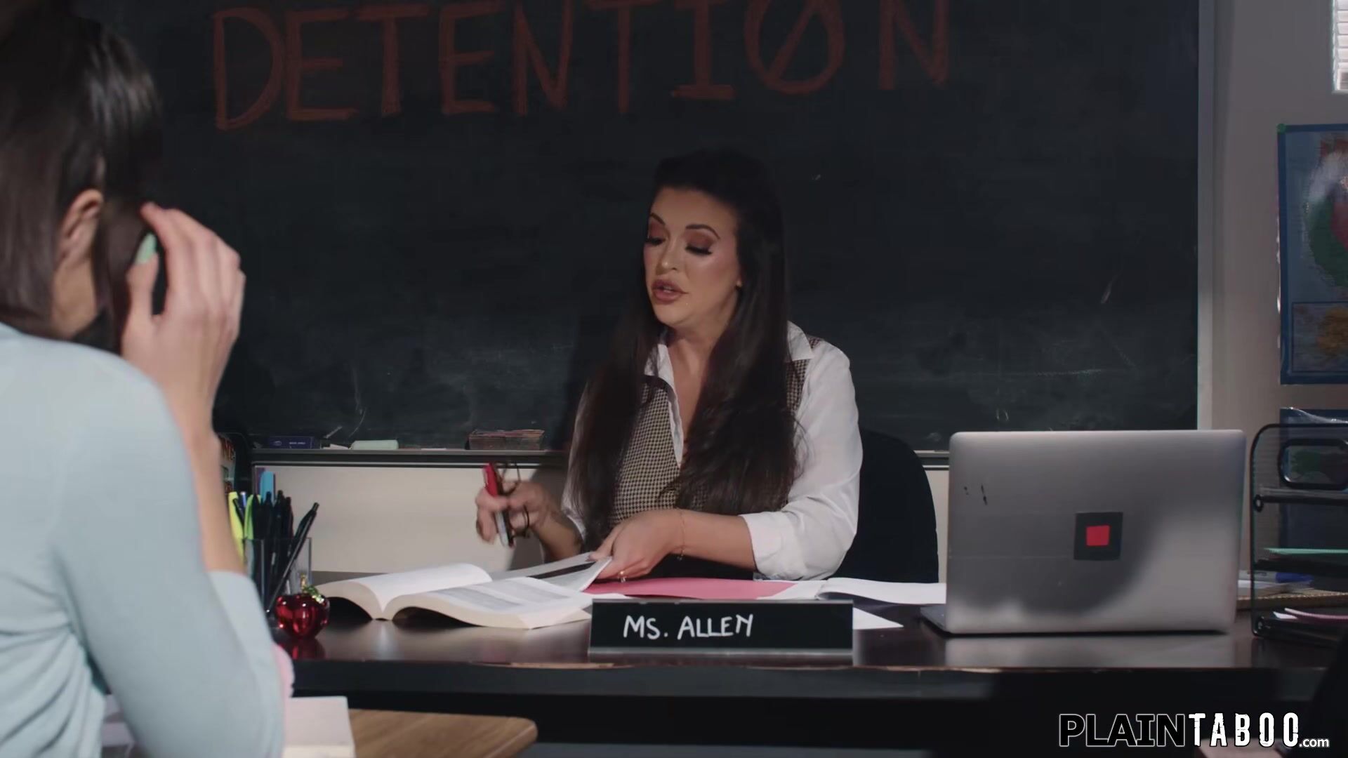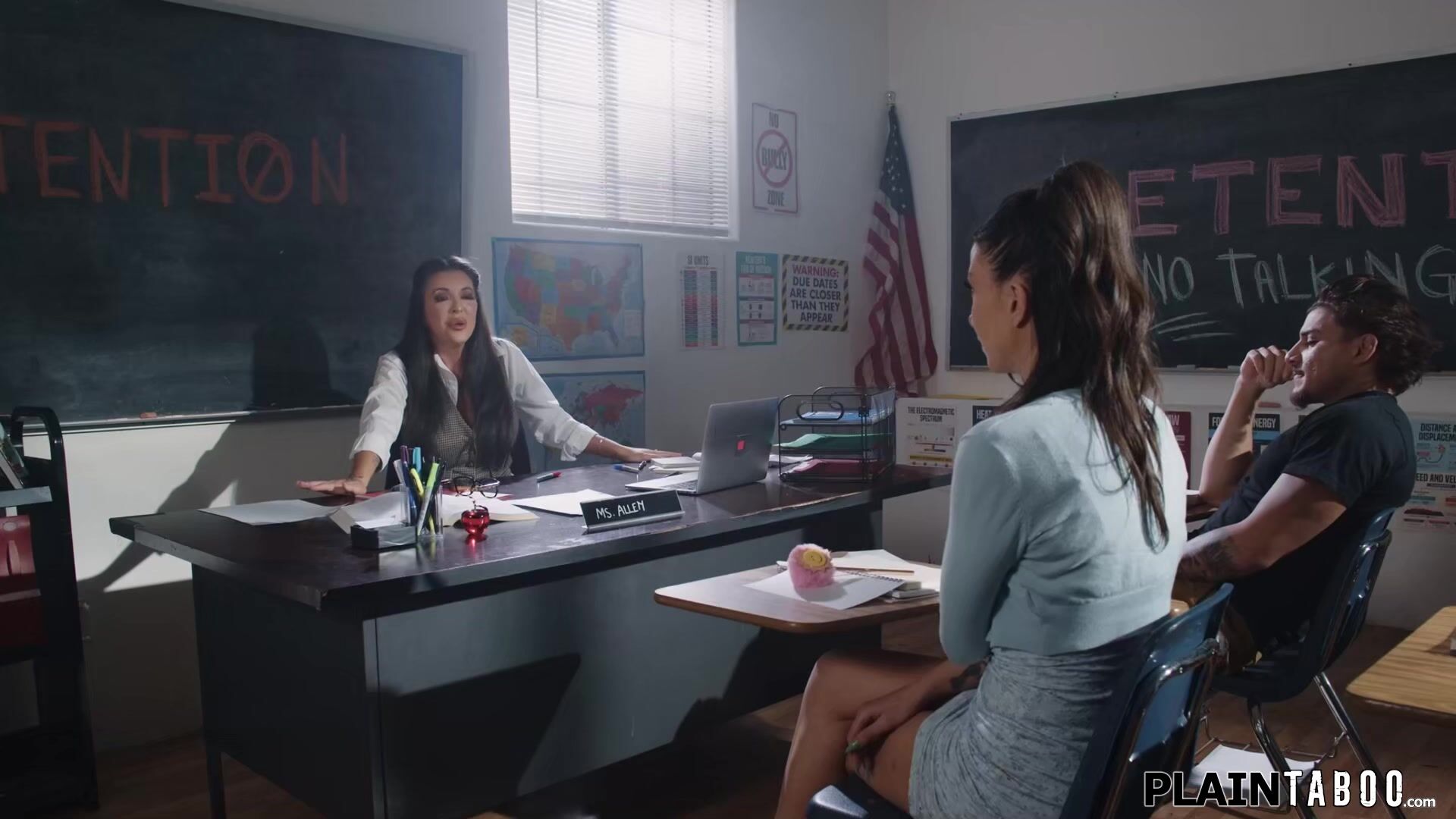 Teacher Elizabeth Sky is done with the filth of her students Natalie Brooks and Victor Ray and demands they will have sex in front of her.The teens kiss and the latin is licked and rimmed before deepthroating a big cock.The petite babe is banged