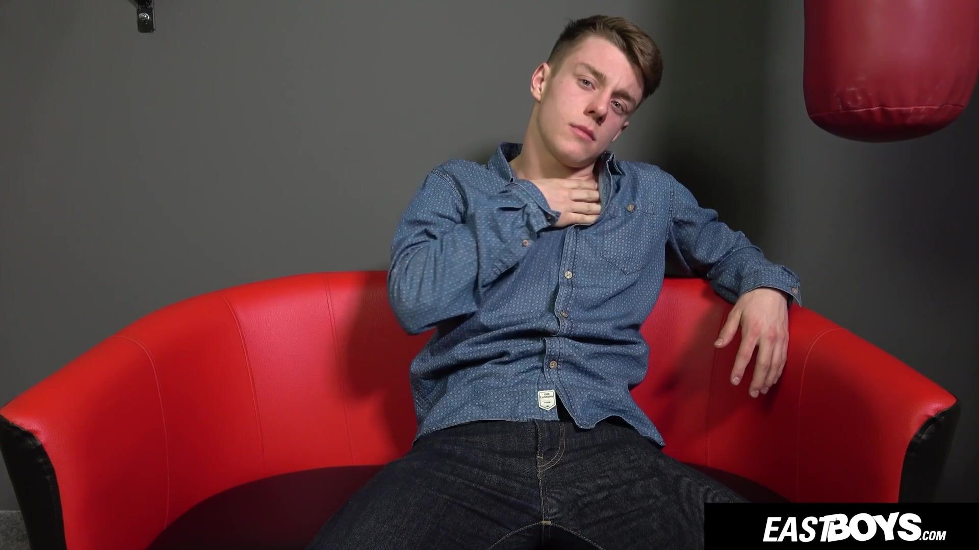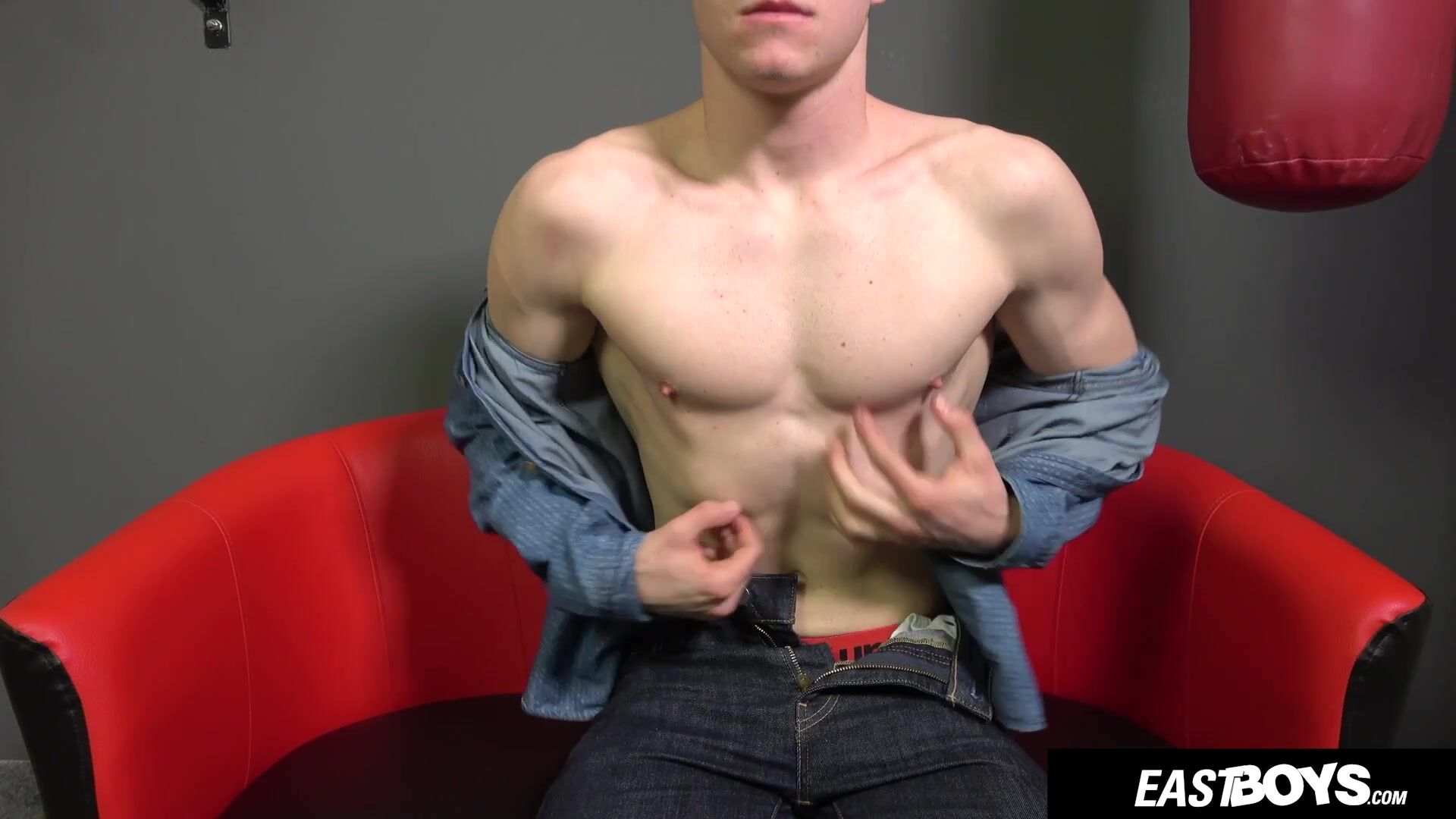 Watch this handsome blonde Czech boy Victor Schumann slowly undress his denim shirt and jeans on a red chair next to a punching bag. He reveals his fit body, pulls down his underwear, and grips his thick cock and big balls, jerking off with intense pleasure. Steamy solo masturbation session!