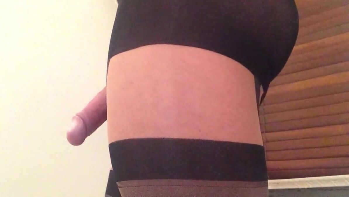 Close up of my cock in suspender pantyhose .