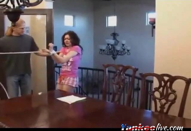 Bound and tape gagged slut gets fucked on the table Video