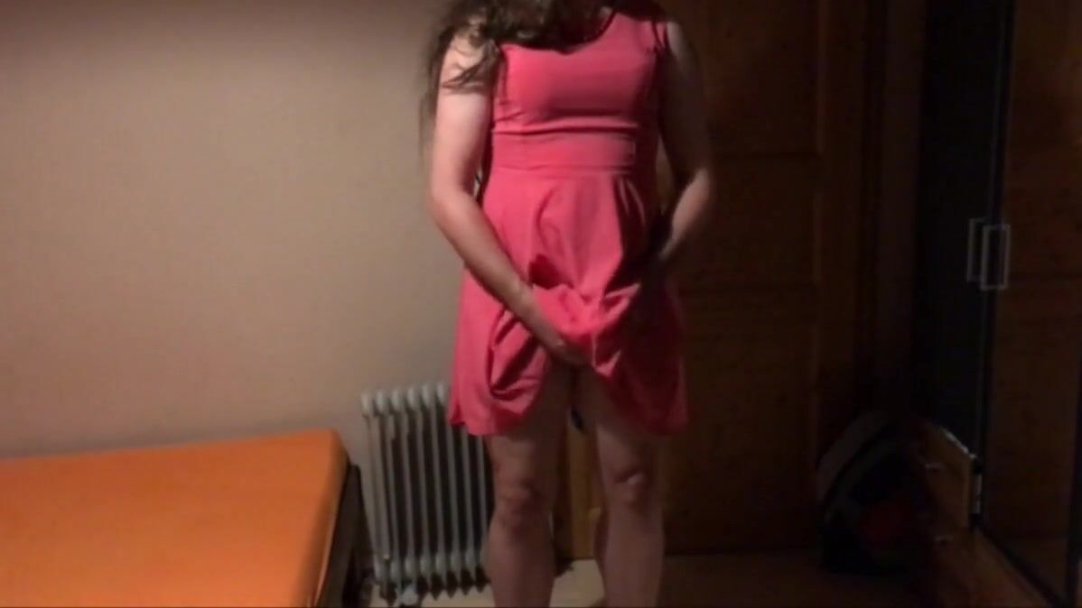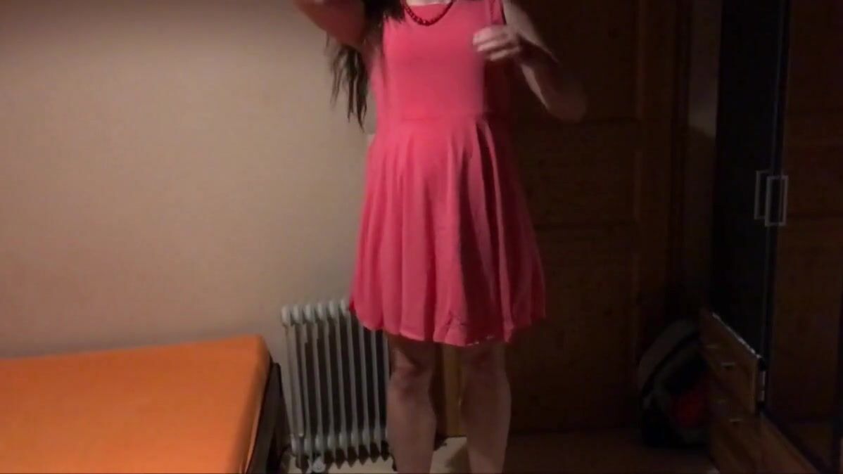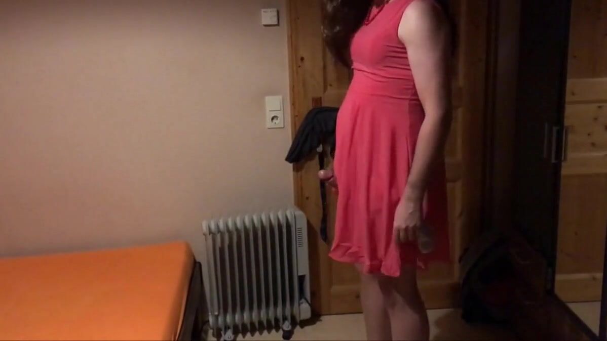 Sissy in pink dress strokes her cock with cumshot on face Video