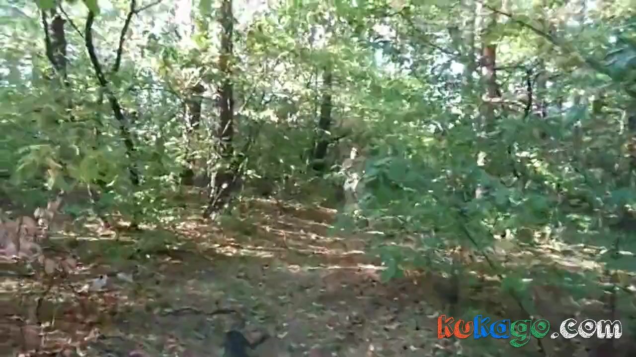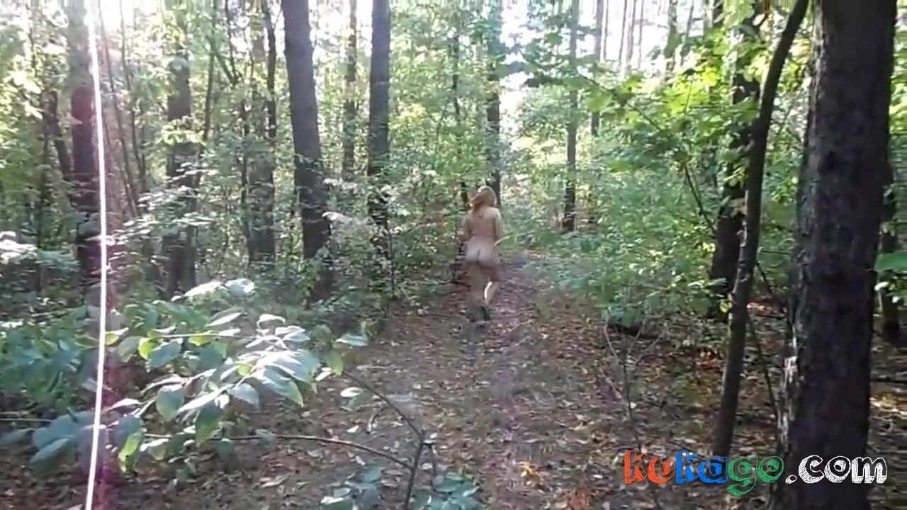 Description: nude chubby girl with big booty walking naked in the forest