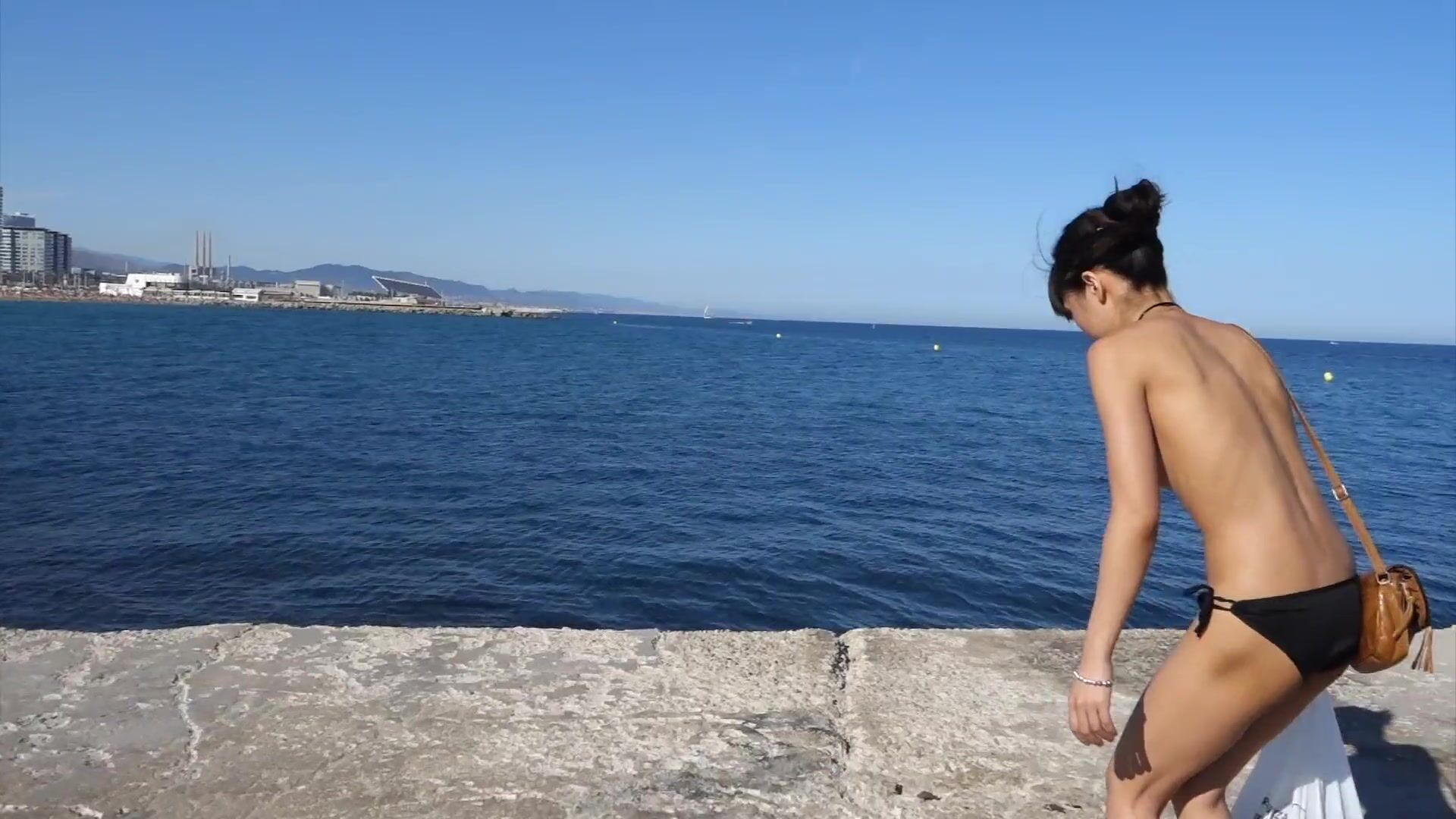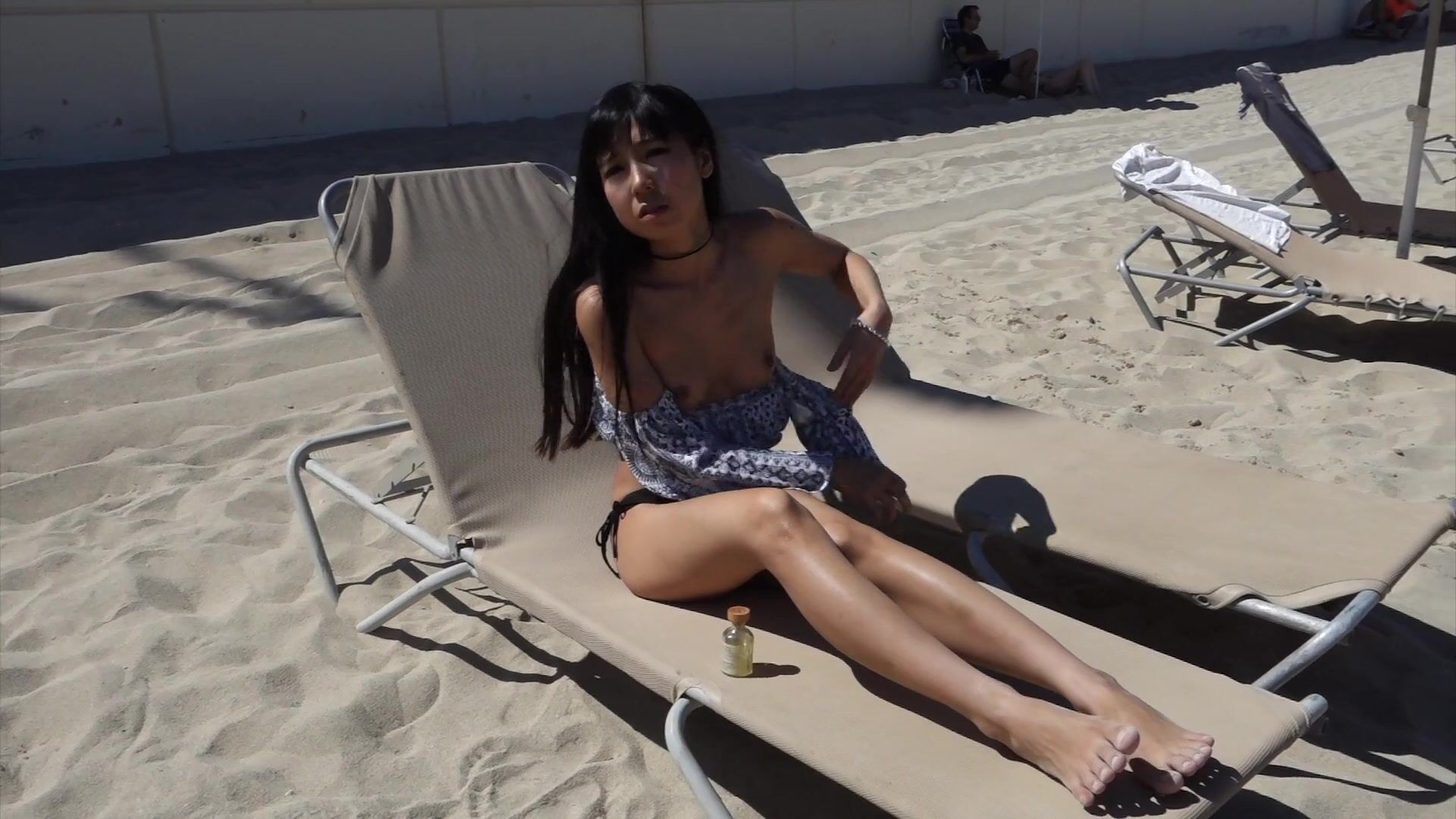 The concept is that I am topless and oiled up, wearing only bikini panty and high heels to pull attention towards me as much as possible, making it far more riskier to flash my pussy or masturbate in public. I took off my top, revealing my perky tits underneath. Then grab a bottle of oil and begin to rub it all over until my skin gleams. I walk around topless and oiled up all over public beach showing my perky tits to strangers! I spread my legs and ready to fuck my pussy till the police come and I thought for sure I was going to be arrested! I pull my panty aside, dripping with the excitement of public exposure, until I squirt all over and make a big mess while people are walking by and riding their bikes! My fun isn't over yet! I took off my bikini panty and get completely naked in public! I walk naked while people starring at me.