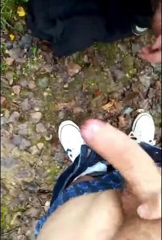 Description: dad and son having fun in the forest