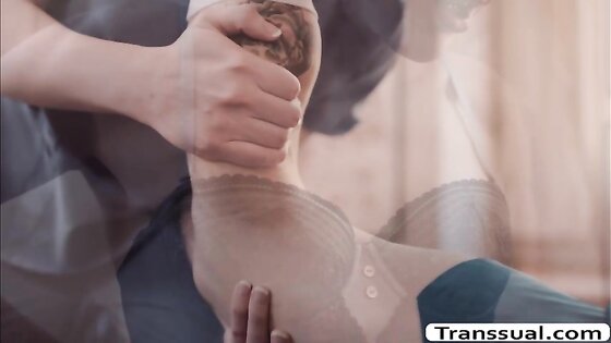 Smalltits TS masseuse lets her handsome customer lay down on the massage table so she can start massaging him.After that,they get horny and she lets him suck her shecock and she then licks his ass before she fucks it so hard.