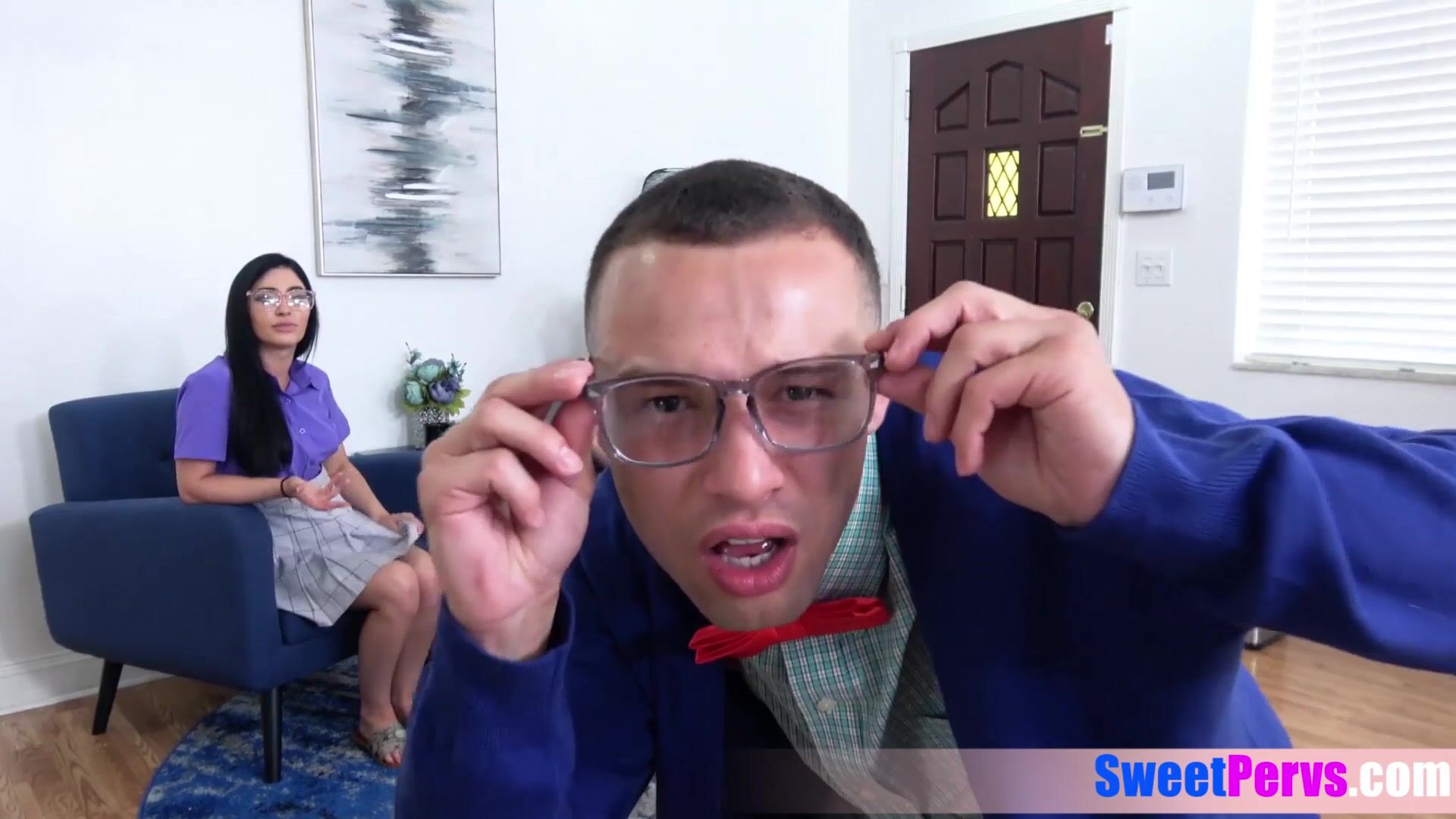 Nerdy teen trio with big boos in sexy uniform with glasses want to loose their virginity and they find the perfect solution They sharing a bookworms big cock and after a blowjob he fucking then during they licking each other