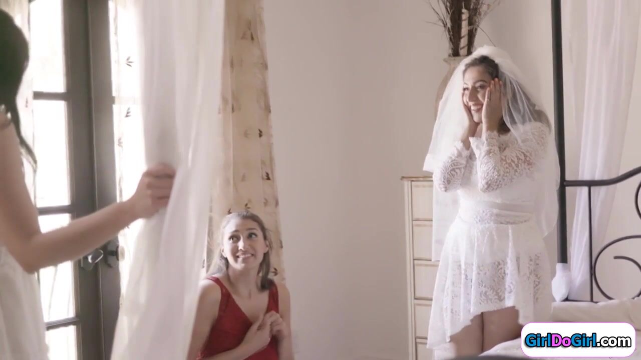 Busty maid of honor secretly licks the big tits bride when the other bride comes in.She gets both naked and the three lesbians kiss.They start licking pussy and the bestie facesits the bride while her lover give oral.The brunettes then trib