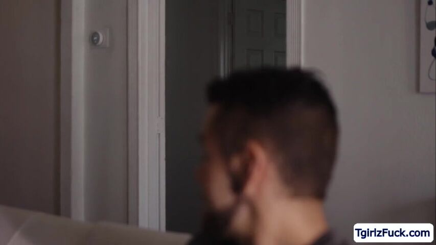 Dante Colle goes to see his friend Derek but he is suddeny called for work. So he is left with his friends blonde stepsister Jenna Gargles. The slender blonde ts dirty talks him while combing her hair until she slowly draws near to ucka nd takes his cock up her tight ts ass.